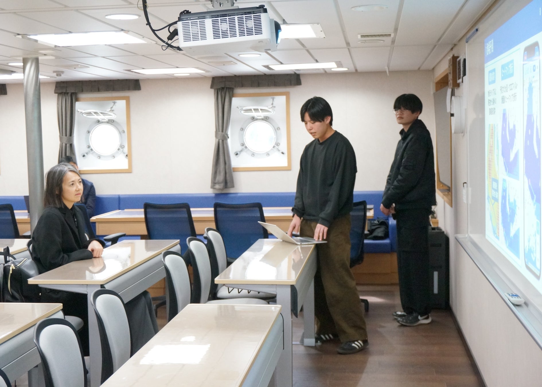 当日は、練習船「鳥羽丸」の見学のほか、学生によるAI・IoT技術を活用した取組事例、国際交流の現状について紹介を行いました。その後、国際的な人材育成や技術協力の可能性などについて、意見交換が行われました。
