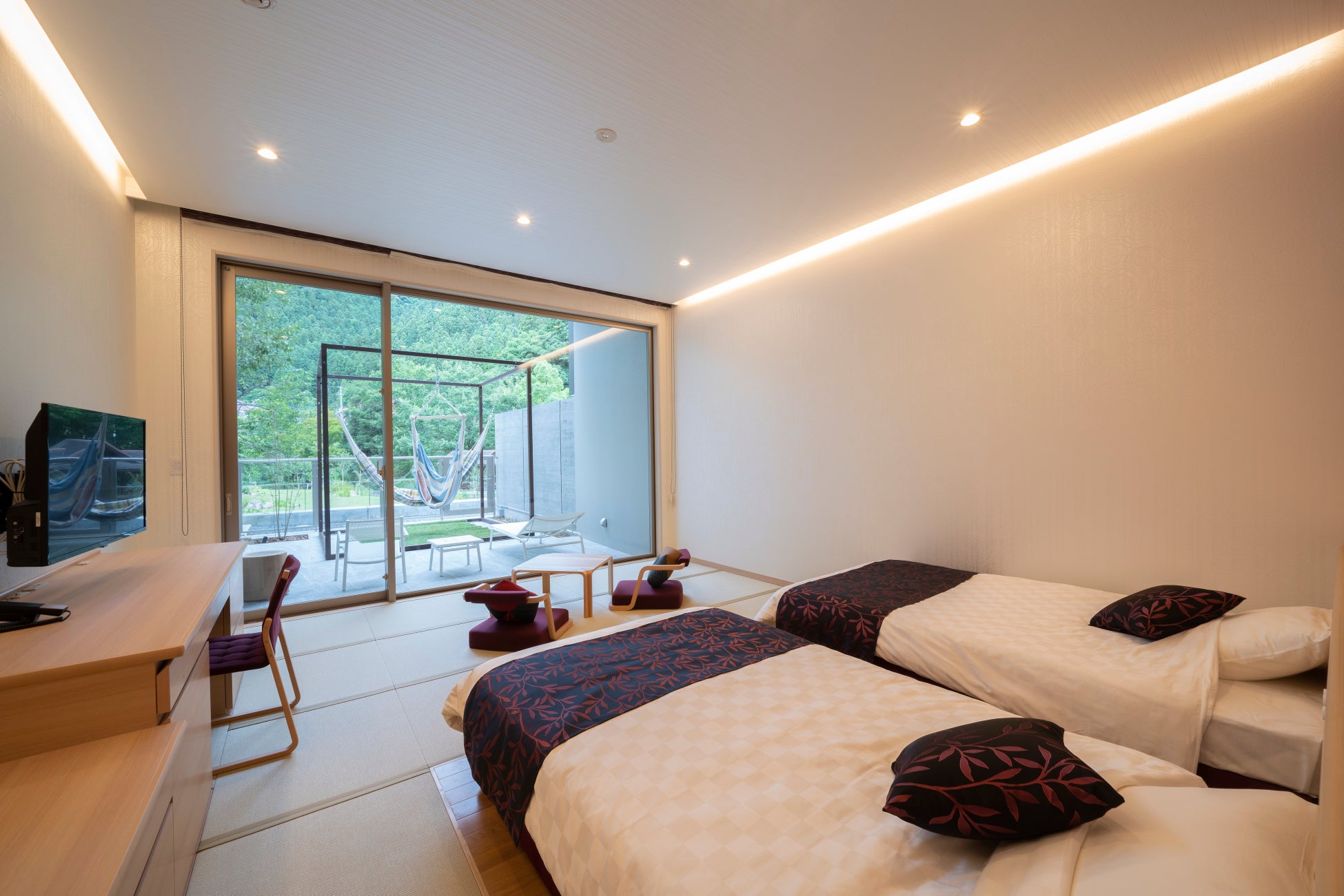 埼玉県飯能市西部、高麗川の清流に囲まれ、里山の風景が色濃く残る自然豊かな場所に立つリゾートホテル。2018年には「にしかわ館」を増築し、浴室やレストランもリニューアルしてグランドオープンしました。「ムーミンバレーパーク」のオフィシャルホテルとして「ムーミンスペシャルルーム」も販売。夕食後には「月と星のテラス」で開催する「スタービューイング」や、土曜日に開催する「朝ヨガ」「週末焚火倶楽部」などの体験プログラムも人気です。