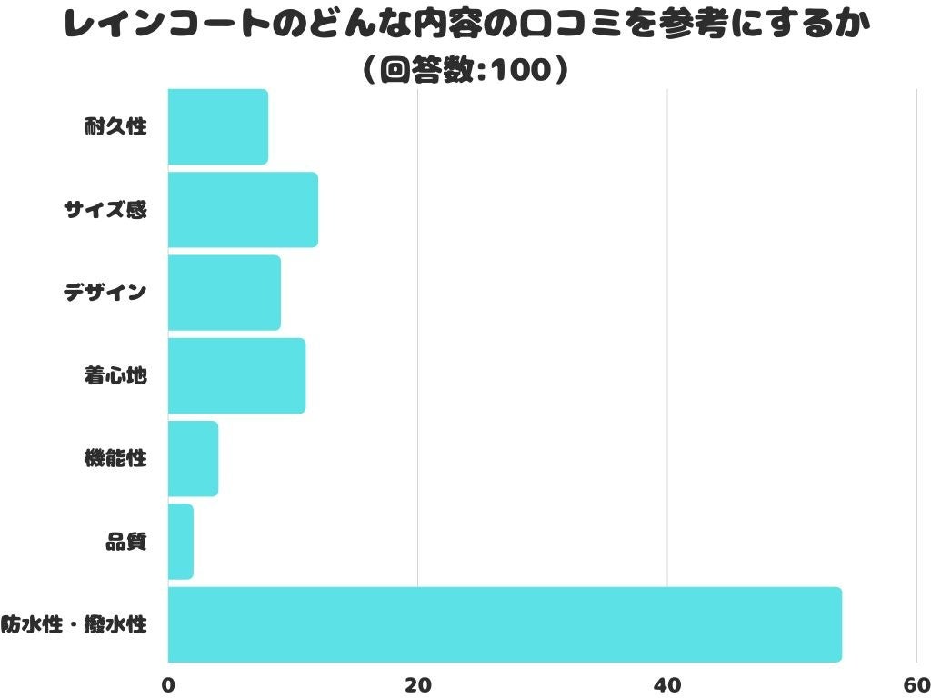 レインコートのどんな内容の口コミを参考にするかをアンケートにて調査したところ、1位は「防水性・撥水性」でした。