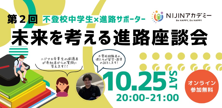 株式会社NIJIN(本社:東京都江東区、代表取締役:星野達郎)が運営する不登校オルタナティブスクール『NIJINアカデミー』は、不登校の小中学生とその保護者を対象に、進路やキャリアについて一緒に考えるオンラインイベント『未来を考える進路座談会』を、2025年10月に開催しました。