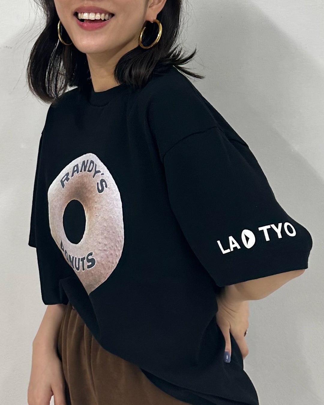 LAのランドマークである米国「ランディーズドーナッツ」1号店の屋根上にそびえ立つ巨大なドーナツ型サイン看板を大胆にプリントしたTシャツ。バックには「ランディーズドーナッツ」のコンセプト、左袖には“LA→TYO”をデザインしました。5.7オンスの綿100%のミディアム生地を使用。適度なルーズ感があるシルエットのため、ユニセックスでお楽しみいただけます。