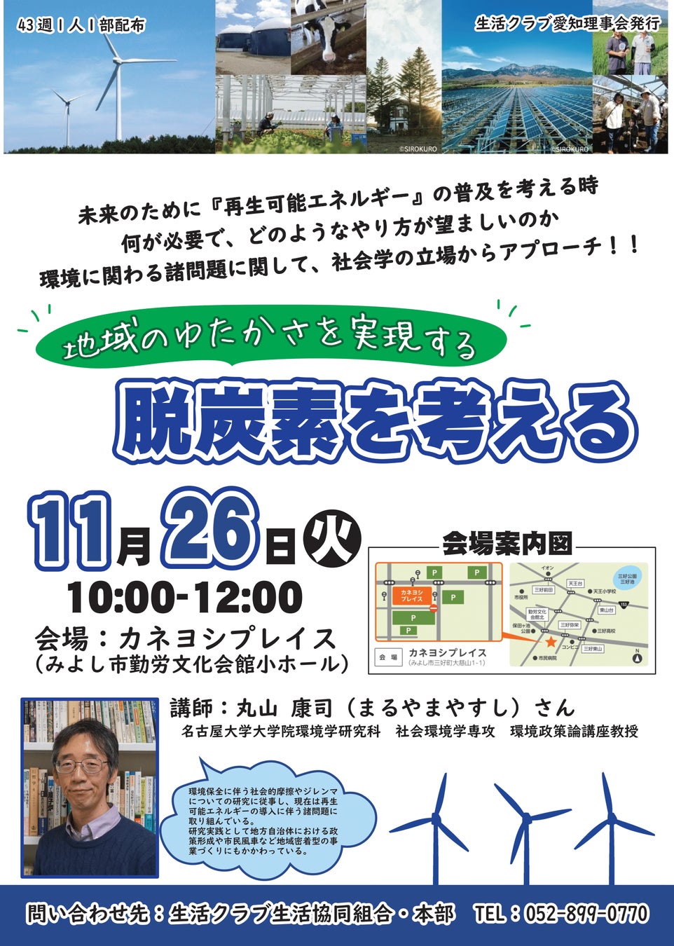 生活クラブ愛知が 名古屋大学大学院教授 丸山康司氏をゲストに 11/26(火)愛知県みよし市のカネヨシプレイス・小ホールにて
