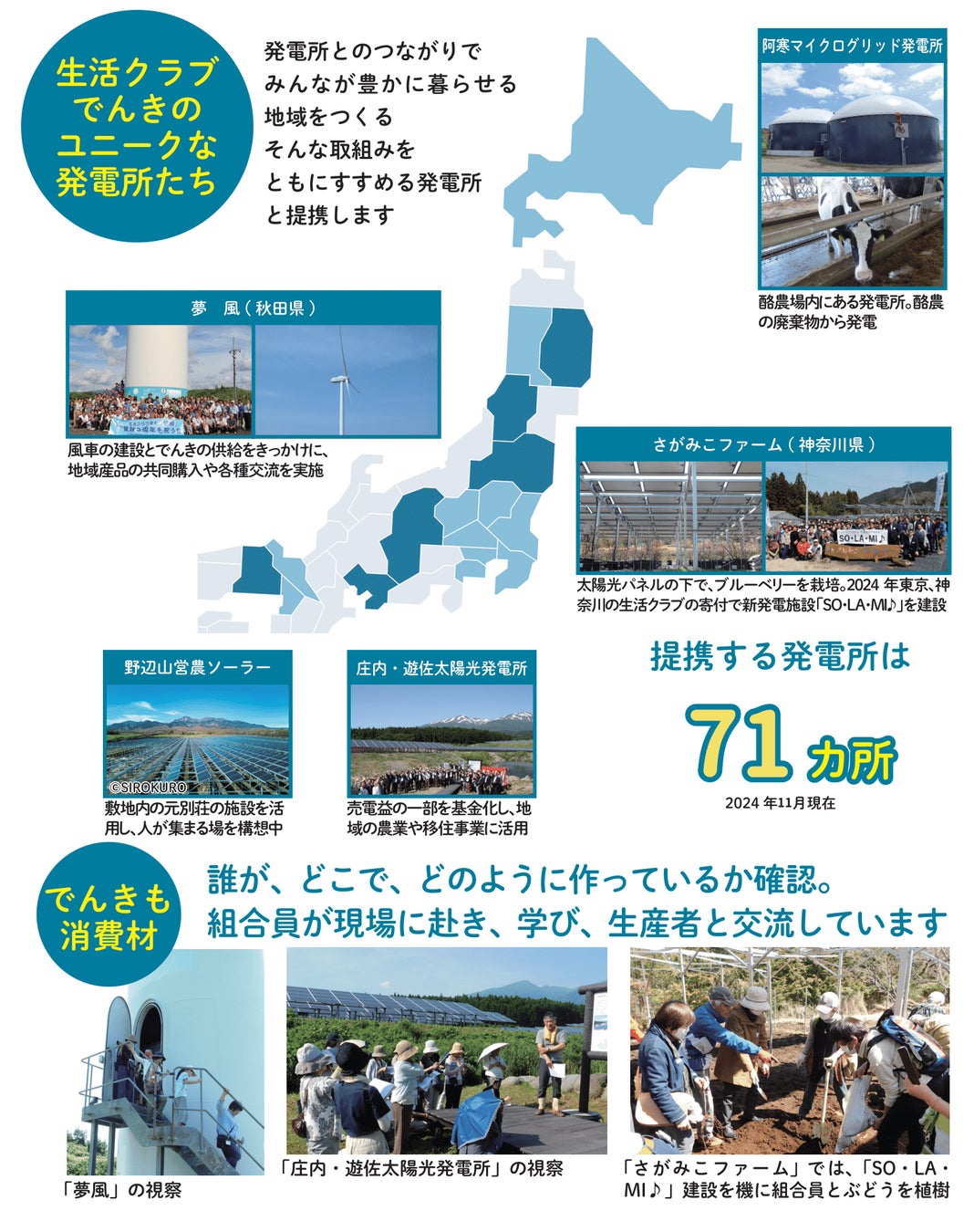 2024年11月現在、全国に71の提携発電所を持ち、1万8千人以上の組合員宅や提携生産者などに再生可能エネルギーを中心とする電気を供給しています。