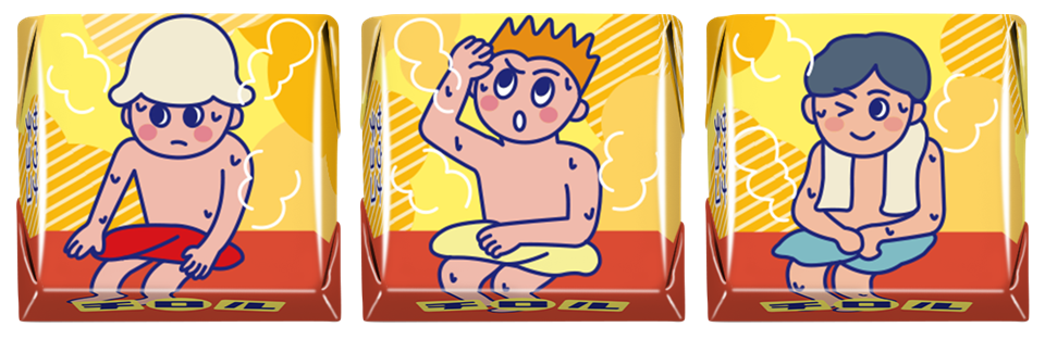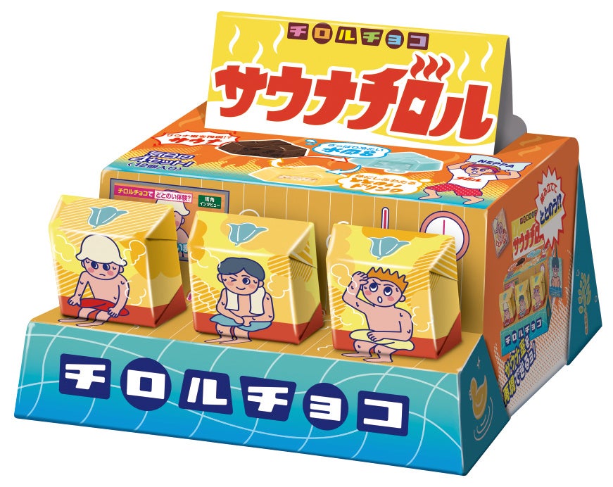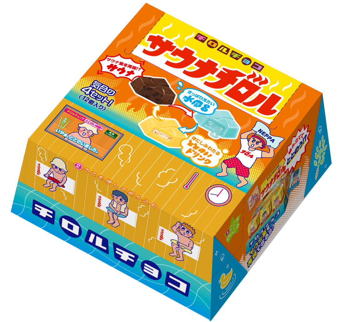 組み立てると立体的なサウナ室が完成する、見て・食べて楽しめるチロルチョコならではの商品です。BOXの中には、3つのフレーバー入り。サウナチョコ→水風呂チョコ→ととのいチョコの順に食べる事で『ととのう』サウナの疑似体験ができます。サウナ室内で高温の蒸気をあおぐ「熱波師」をデザインに入れるなど、細部までこだわりを詰め込みました。