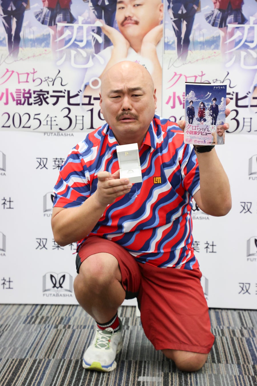 フラッシュが焚かれテレビカメラがズームする中、クロちゃんは『水ダウ』でリチに差し出した婚約指輪を取り出し、箱を開けてカメラに見せながら壮絶な小説執筆秘話を明かした。「4作の短編のうち、1作だけプロポーズしてフラれた後に書いてます。この163万4600円の指輪を見ながら、血の涙を流して作りました」