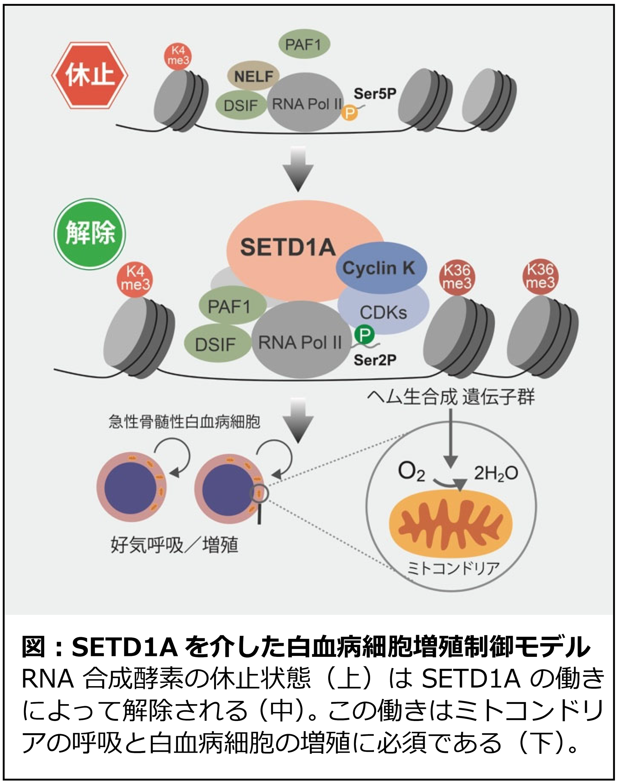 千葉大学大学院医学研究院の星居孝之講師、医学部医学科5年の菊地創太、大学院医学研究院の金田篤志教授らの研究チームは、蛋白質の分解を誘導する技術を駆使し、急性骨髄性白血病細胞の核内にあるヒストンメチル化酵素であるSETD1A(注1)を分解すると、白血病細胞が死滅することを確認しました。またさらに詳しい解析により、SETD1Aがミトコンドリアの呼吸を制御するメカニズムを明らかにしました(下図)。