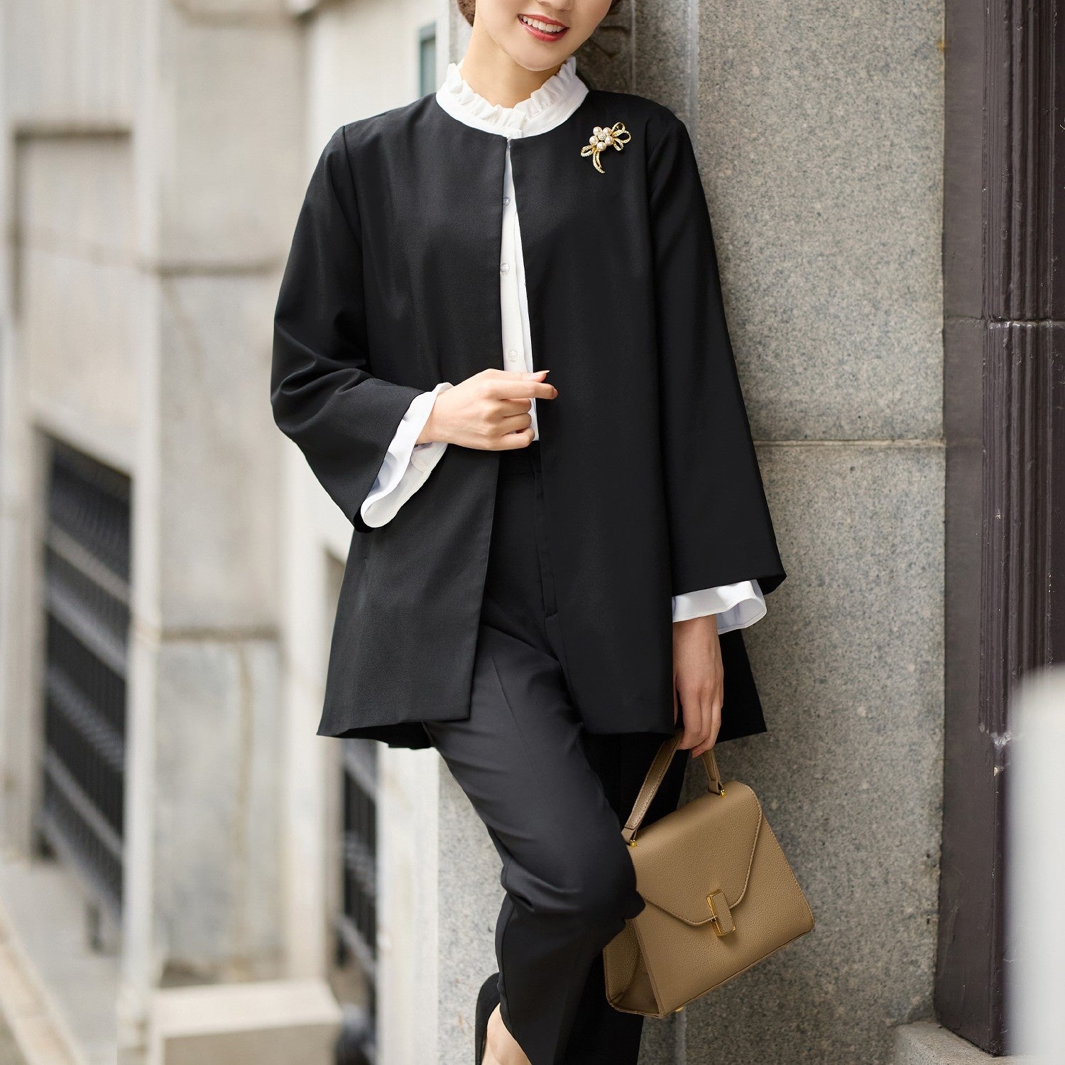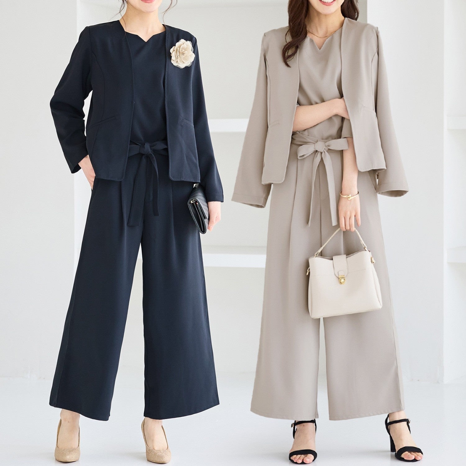 ■特長:ノーカラージャケット・キーネックデザインブラウス・ワイドパンツの3点セット。ジャケットは、首周りがすっきり見えるノーカラータイプです。ブラウスは、キーネックデザインでスタイリッシュな雰囲気を保ちつつ、 7分袖のフレアースリーブで二の腕カバーも叶えます。パンツは、脚のラインを拾いにくいシルエットがポイントです。3点とも伸縮性のあるカットツイル素材を使用しており、程よく光沢感のある表面感で上品な印象を演出します。