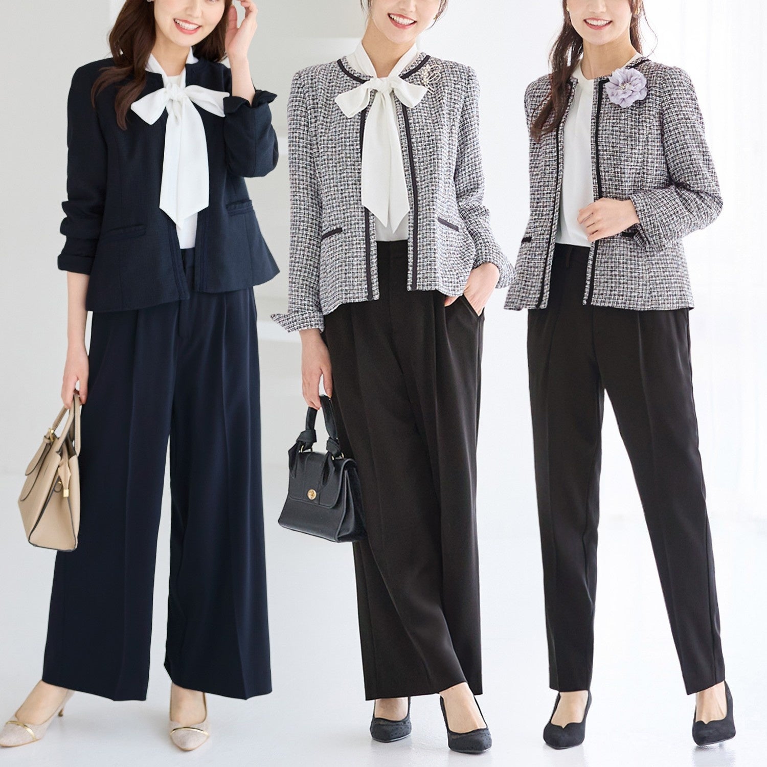 ■特長:ノーカラージャケット・タックデザインブラウス・選べるパンツの3点セット。ジャケットは、大人上品なツイード素材を使用したノーカラーデザインで、きちんとした印象を演出します。ブラウスは、上品な質感で肌ざわりの良い布帛素材を採用し、タックデザインがきれいめな印象をプラスします。パンツは、テーパードシルエットとストレートシルエットの2種類から、お好みのタイプをお選びいただけます。