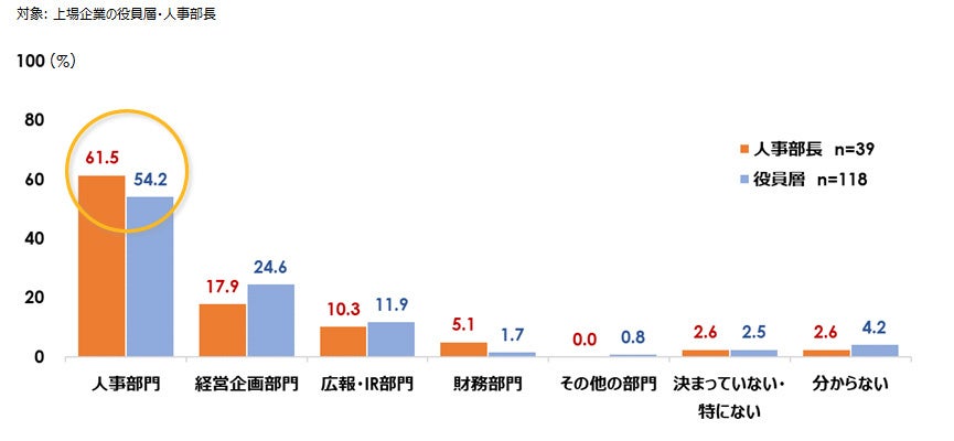 上場企業の役員層と人事部長それぞれに対し、人的資本情報に関する議論を主導する主管部署※4を確認したところ、役員層・人事部長いずれにおいても最も多く挙がった部署は「人事部門」であった。次いで、「経営企画部門」が2割前後、「広報・IR部門」が1割程度となっている。人的資本情報の開示においては、《人》に関わる情報ゆえに人事部門が関与するのは必然であろうが、それ以外の部門も含め、各部門が連携して準備を進めている様子がうかがえる。