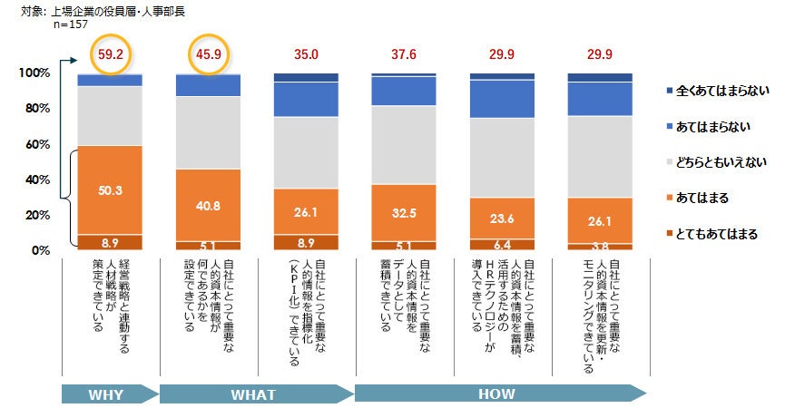 上場企業の役員層・人事部長に対し、人的資本情報のマネジメント実態※5を確認したところ、「経営戦略と連動する人材戦略が策定できている」との回答は59.2%であった。また、「自社にとって重要な人的資本情報が何であるかを設定できている」との回答は45.9%であった【図表6】。