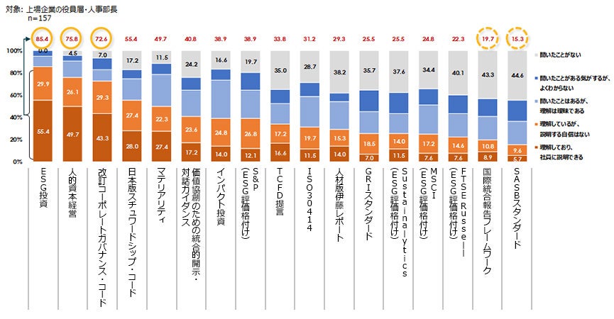 上場企業の役員層・人事部長に対し、非財務情報の開示基準や関連用語についての理解度※1を確認したところ、「ESG投資」が最も高く85.4%、次いで「人的資本経営」(75.8%)、「改訂コーポレートガバナンス・コード」(72.6%)であった。経営者や投資家に広く認知されている「ESG投資」と同様に、「人的資本経営」の理解度も7割を超えており、人的資本経営の概念は一定程度、普及してきているものと考えられる。一方、具体的な情報開示指針となる「SASBスタンダード」(15.3%)や「国際統合報告フレームワーク」(19.7%)等の理解度は、他の用語と比べて低い傾向であった。