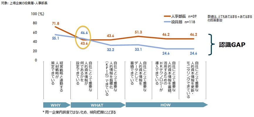 役員層と人事部長の回答を比較して見ると【図表7】、「自社にとって重要な人的資本情報が何であるかを設定できている」との回答は、役員層46.6%、人事部長43.6%と階層による認識ギャップも軽微であった。一方で、「自社にとって重要な人的資本情報をデータとして蓄積できている」との回答は、役員層33.1%に対し、人事部長が51.3%であるなど、〈HOW〉の部分の項目を中心に両者間の現状認識の乖離が示唆される結果となった。
