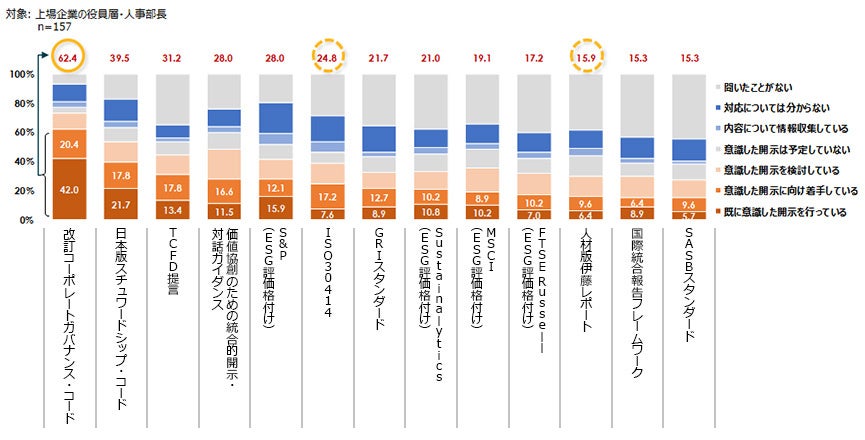 上場企業における非財務情報の開示基準への対応度※2は、「改訂コーポレートガバナンス・コード」(62.4%)を除いては全般的に低い。人的資本に特化したものとしては、「ISO30414」が24.8%、「人材版伊藤レポート」が15.9%であった。
