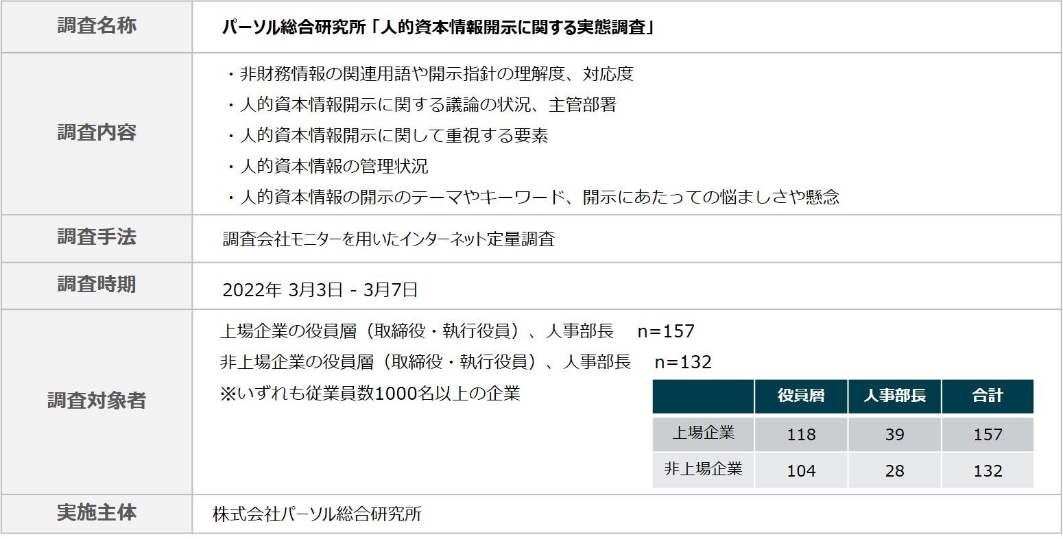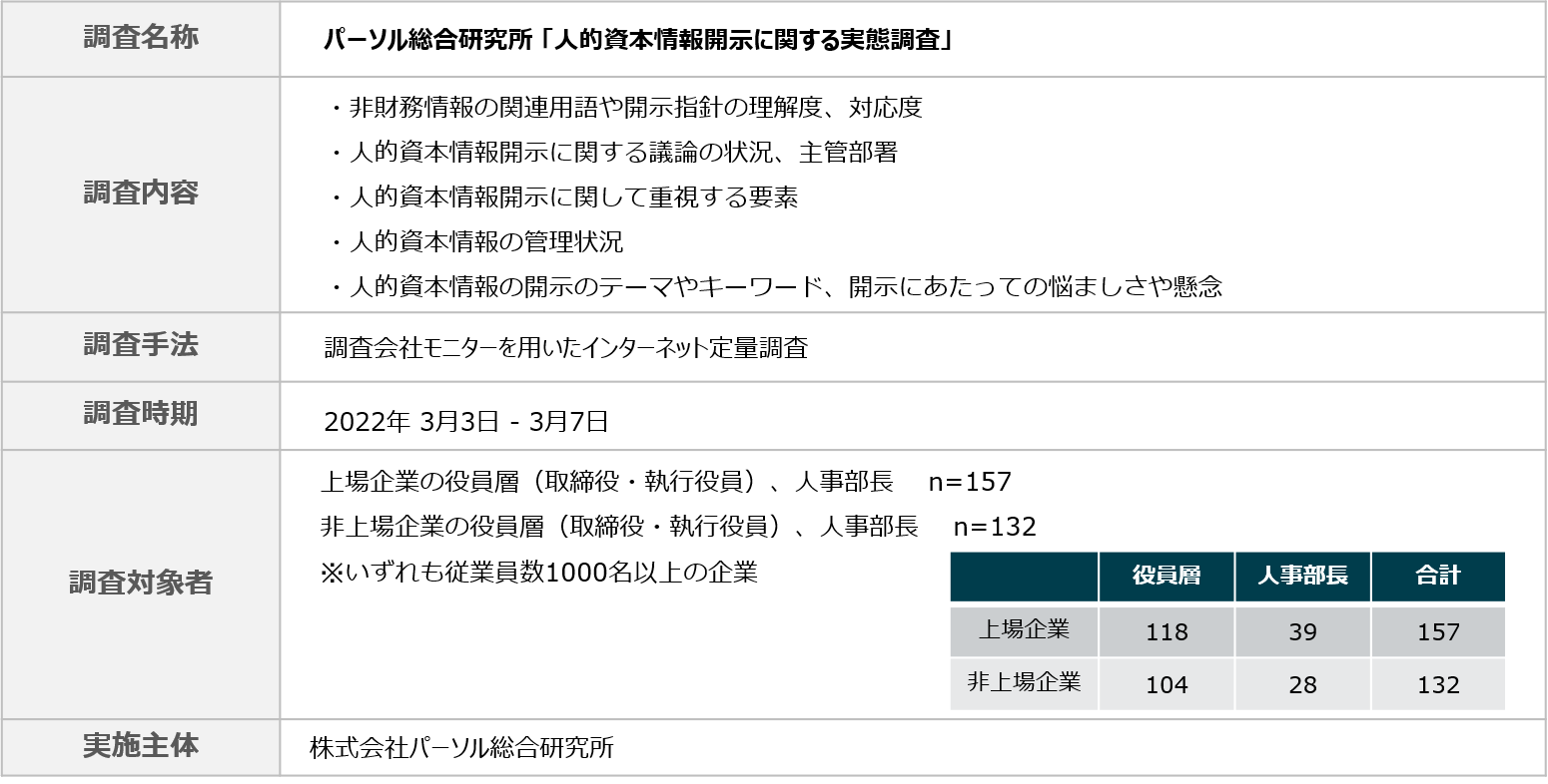 株式会社パーソル総合研究所(本社:東京都港区、代表取締役社長:渋谷和久)は、人的資本情報開示に関する調査結果を発表いたします。本調査は、企業における人的資本情報開示に関する理解・取り組みの実態について、定量的なデータで把握し、経営・人事に資する提言を行うことを目的に実施しました。