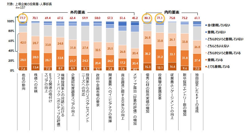 上場企業の役員層・人事部長に対し、人的資本情報の開示に際して重視する要素※3を確認したところ、最も関心が高かったのは「優秀人材の採用実績の増加」(80.3%)、次いで「他社の動向」(77.7%)、「役員層の意識改革」(77.1%)であった。