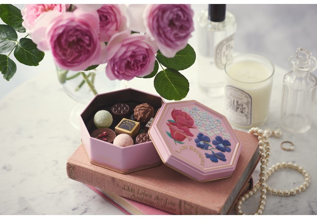 花束をイメージしたフェミニンな缶入りチョコレートアソートメント。