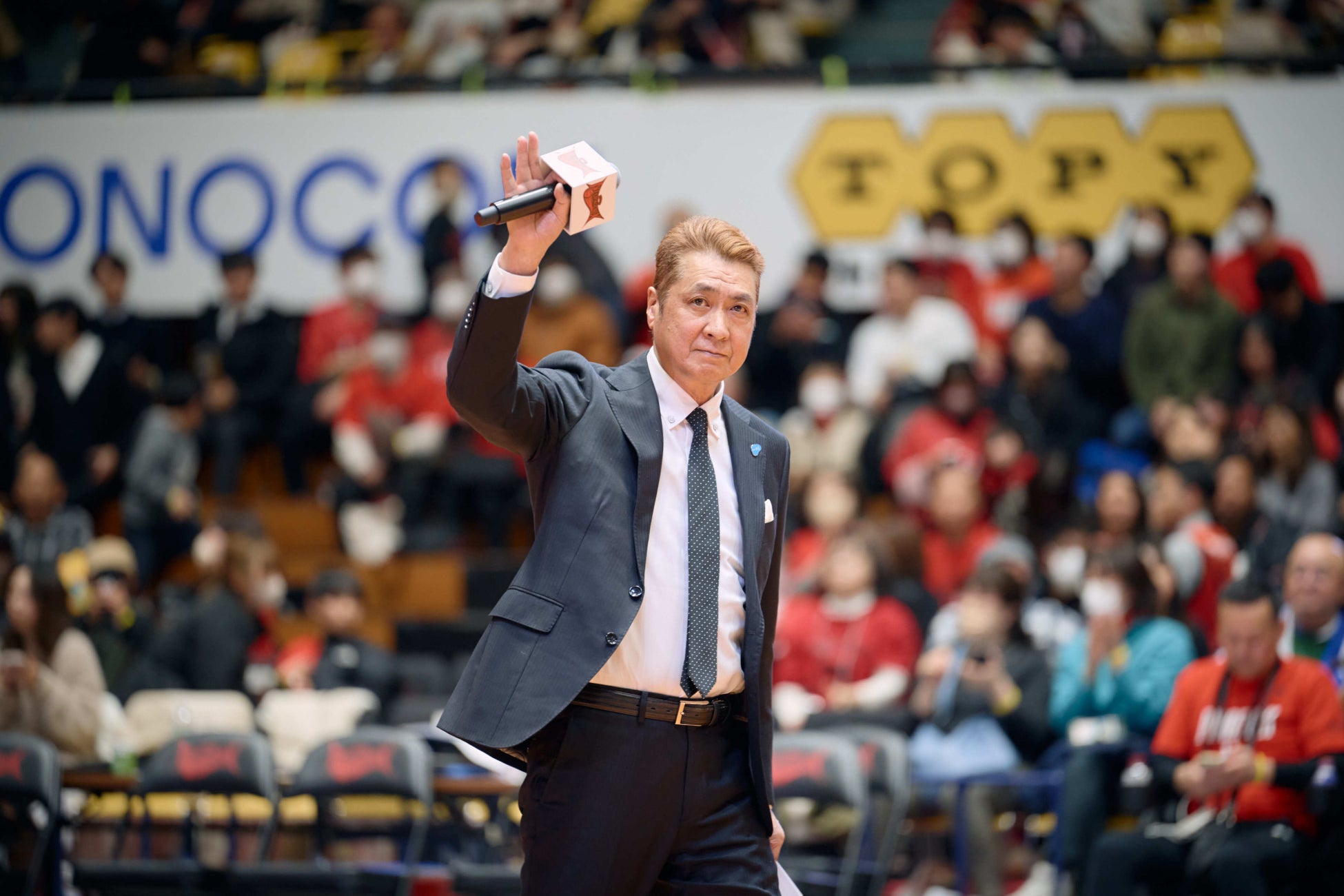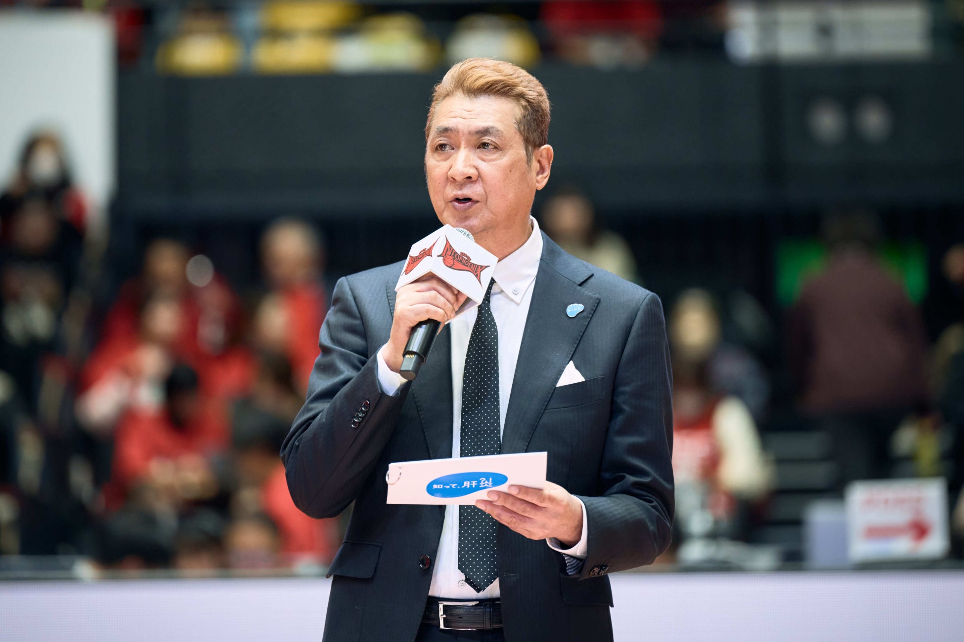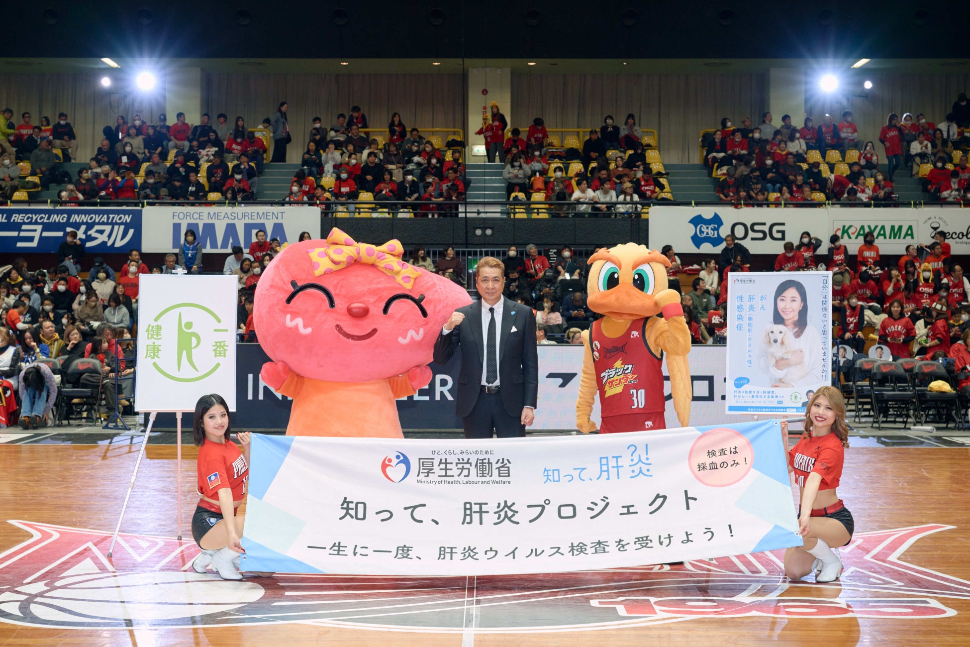 「知って、肝炎プロジェクト」のスペシャルサポーターで演歌歌手の山川豊さんが2025年1月29日(水)夜、男子プロバスケットボールBリーグ1部の試合会場である愛知県の豊橋市総合体育館を訪れ、肝炎ウイルス検査の必要性と健康について考える習慣の大切さを訴えました。