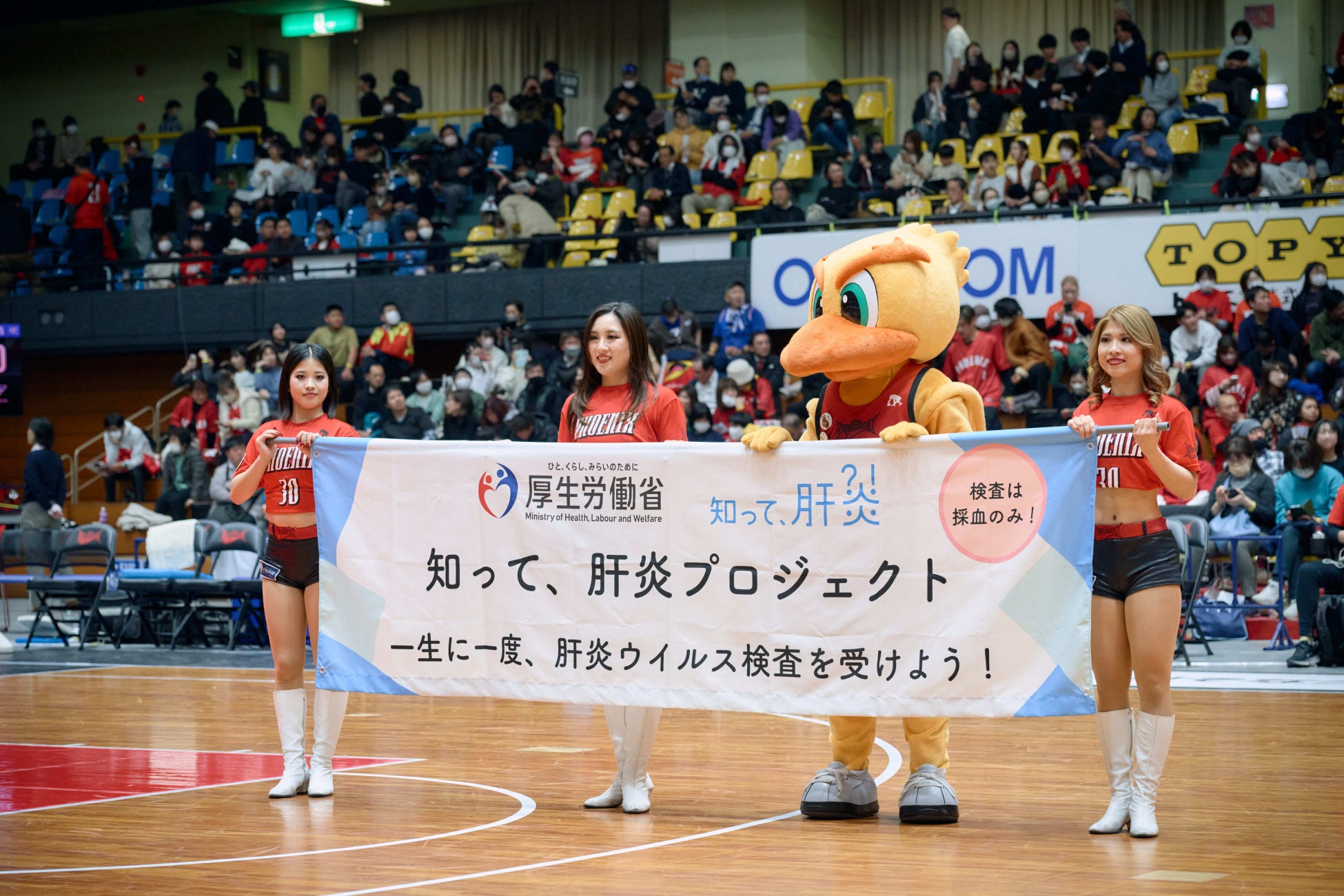 山川さんは、三遠ネオフェニックス対ファイティングイーグルス名古屋戦ハーフタイム中の午後8時すぎに、肝臓の正しい知識を広める活動をしているマスコットキャラクター「肝美ちゃん」と共に登場。「知って、肝炎プロジェクト」の啓発動画放映後、会場に詰めかけた3300人を超えるブースター(ファン)に向けて、健康に対する思いを伝えました。