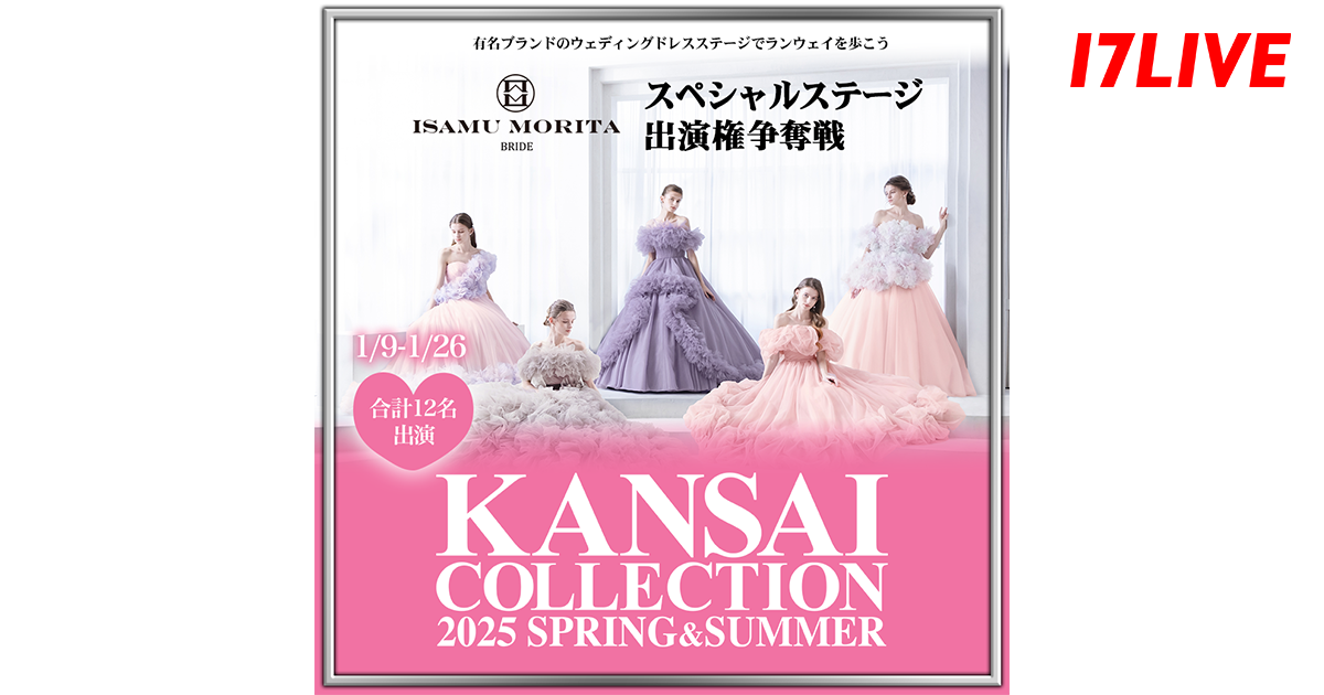 17LIVE株式会社(東京都渋谷区、代表取締役:ジャン・ホンフイ、URL:https://jp.17.live/)が運営する日本最大級のライブ配信アプリ「17LIVE(イチナナ)」は、日本を代表するファッションエンターテイメント「KANSAI COLLECTION 2025 S/S(関西コレクション)」への出演を懸けたオーディションイベント、『KANSAI COLLECTION 2025 S/S ISAMU MORITA BRIDEスペシャルステージ出演権争奪戦』を、2025年1月9日(木)より開催することが決定しましたので、お知らせいたします。