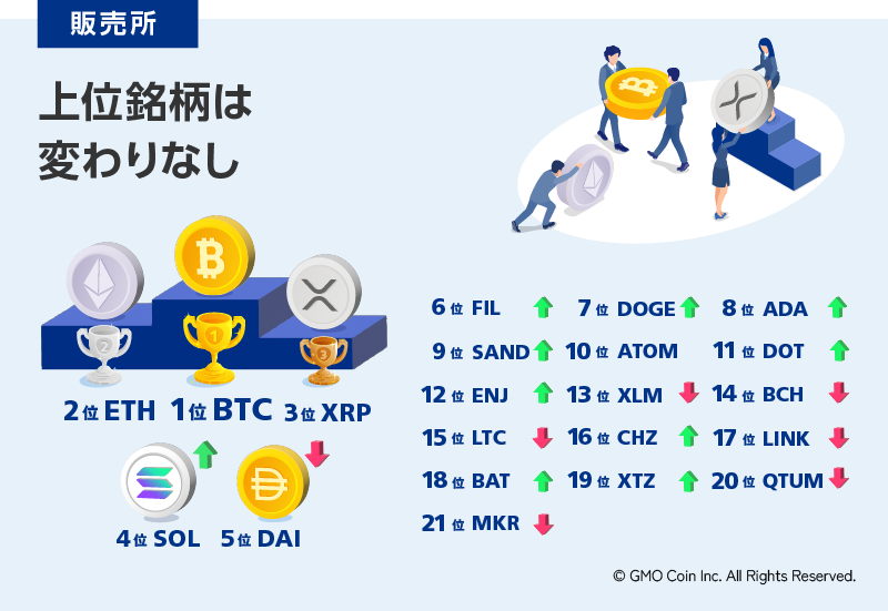 「販売所」では、全体的に取引金額が増えるも、上位銘柄は変わらず、1位ビットコイン(BTC)、2位イーサリアム(ETH)、3位リップル(XRP)、4位ソラナ(SOL)(先月5位)、5位ダイ(DAI)(先月4位)となりました。