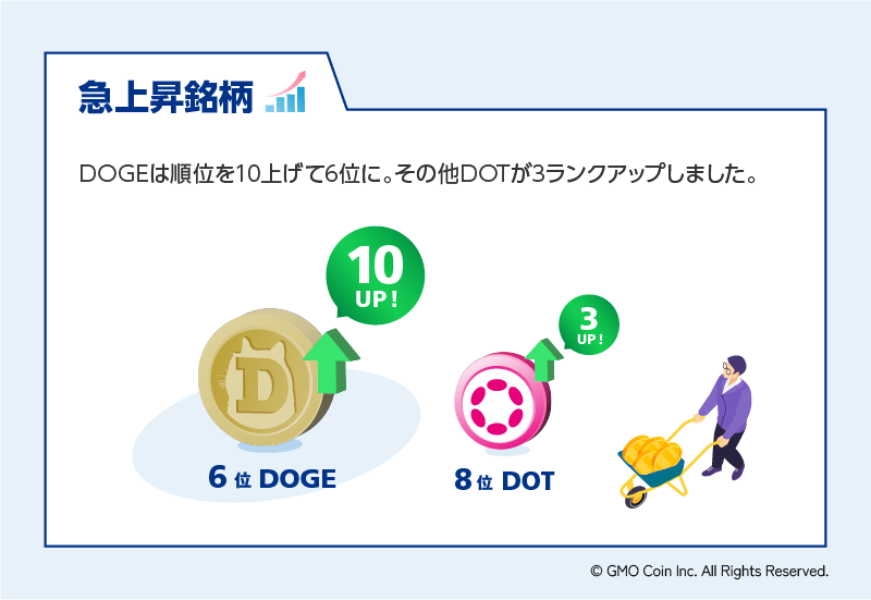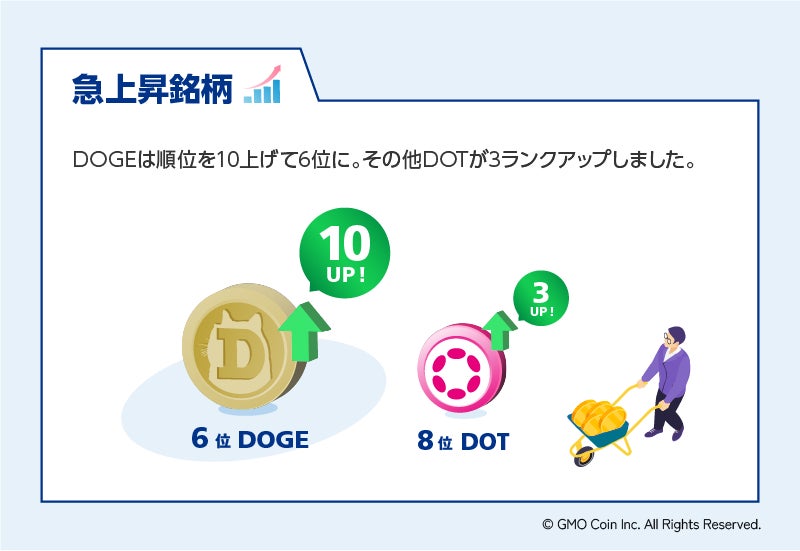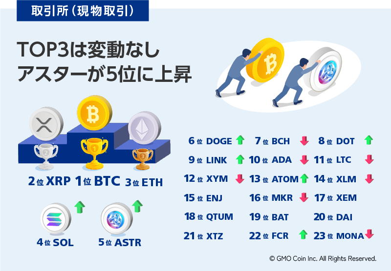 「取引所(現物取引)」では、「販売所」同様ビットコイン(BTC)が1位となり、アスター(ASTR)が5位にランクインしました。先月のランキングと比較すると、ドージコイン(DOGE)が順位を10上げて6位になりました。他にもポルカドット(DOT)が3ランクアップで8位になりました。