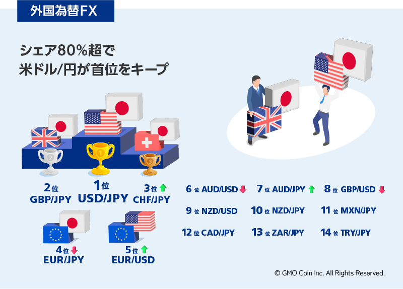 「外国為替FX」では、順位に大きな変動はなく、昨年の高値に迫る推移となったUSD/JPY(米ドル/円)が1位となりました。先月のランキングと比較するとCHF/JPY(スイスフラン/円)が3位にランクインしました。