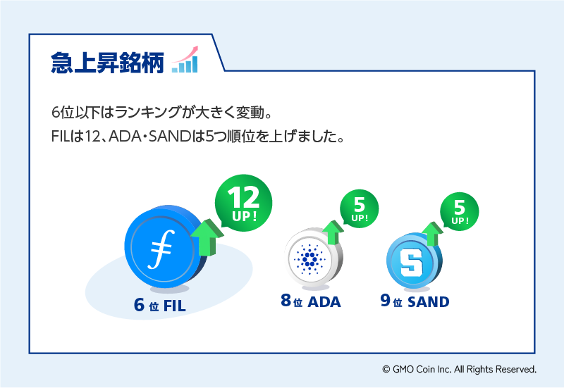 先月と比較すると、6位以下は大きな順位の変動があり、ファイルコイン(FIL)やカルダノ(ADA)、ザ・サンドボックス(SAND)が順位を上げました。中でも、ファイルコイン(FIL)が12ランクアップで6位になりました。そんなファイルコイン(FIL)のニュースとしては、11月に開催されたLabWeek23で、ファイルコインエコシステムの新たなプロジェクトに関する発表がされています。