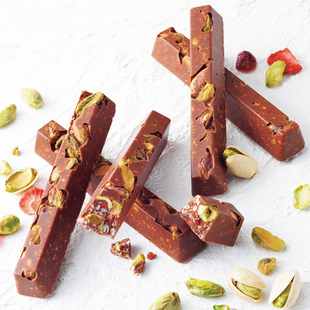 ミルクチョコレートに塩がけしたローストピスタチオを丸ごと入れ、さらに刻んだローストピスタチオ、ドライクランベリー、フリーズドライのストロベリー、クッキークランチやアーモンドパフを合わせました。ベリーの酸味がアクセントの、ピスタチオの旨みがぎっしり詰まった食感の楽しいチョコレートバーです。