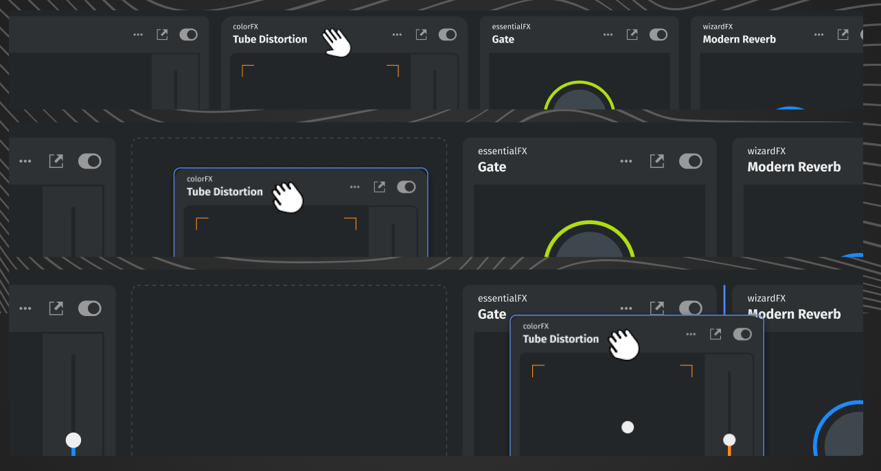 エフェクトの使用がこれまで以上に簡単になりました。すべてのエフェクトを一箇所で制御できます。ドラッグ&ドロップで自分だけのエフェクトチェーンを作成、アレンジできます。エフェクトのオンオフやプリセットの切り替えなども簡単です。