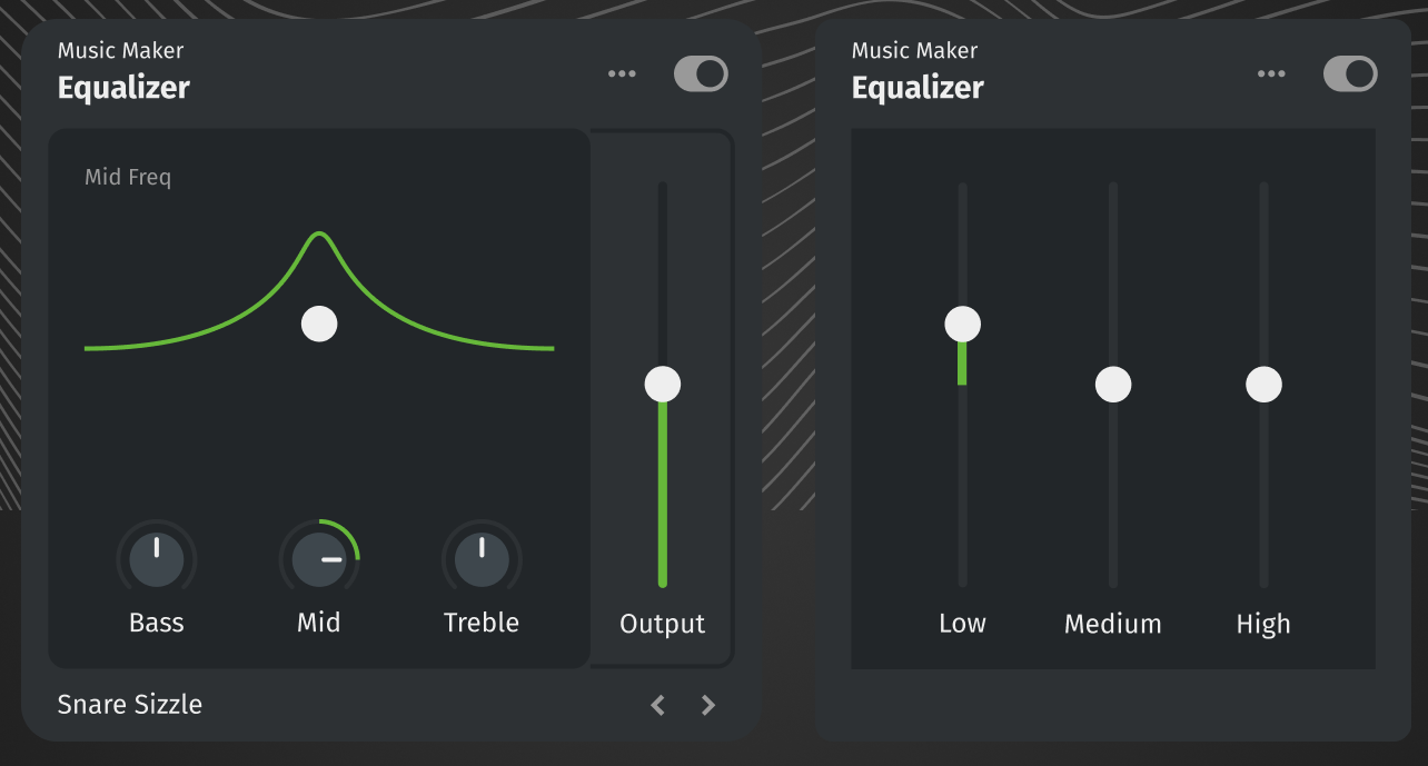 曲の高音、中音、低音の周波数を調整できます。トラックのサウンドを最適化し、好みのサウンドに仕上げられます。