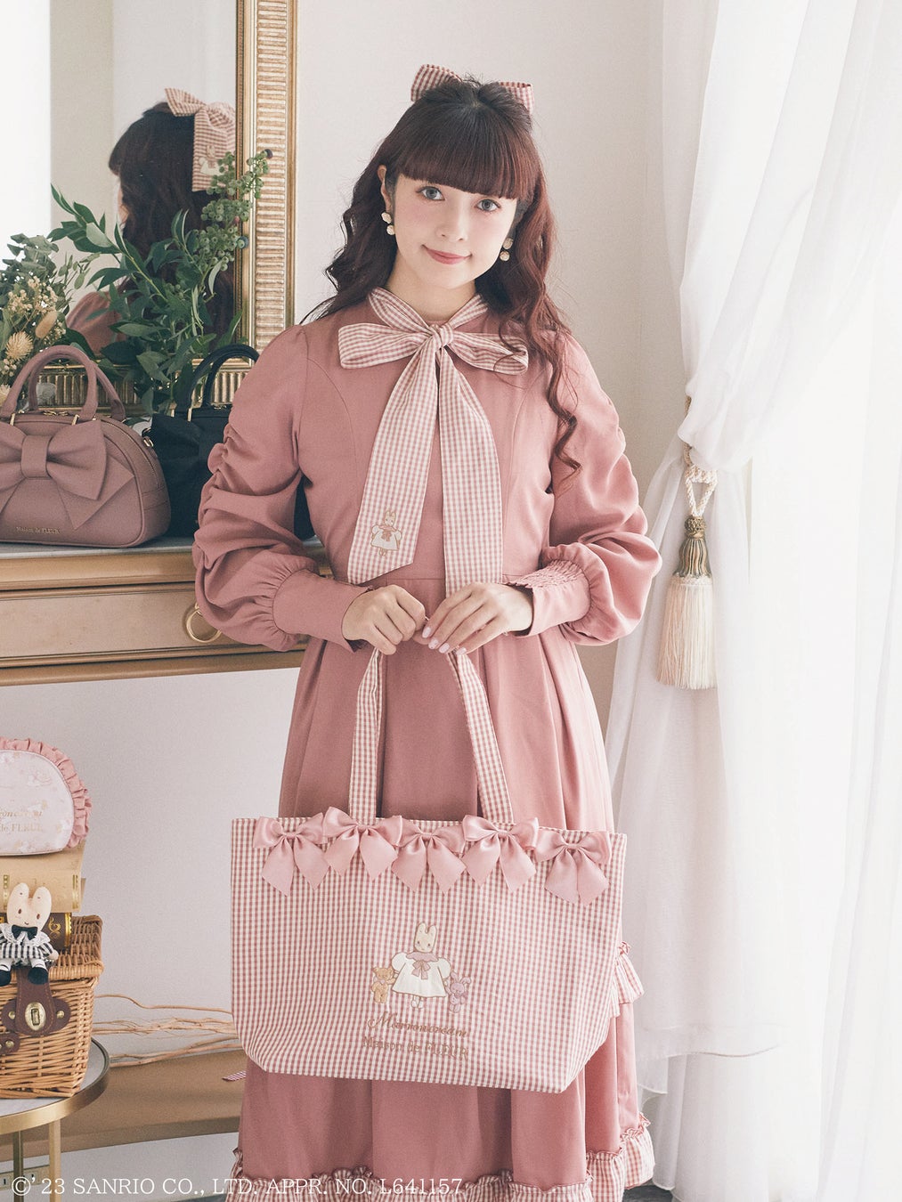 雑貨アイテムでは、裏地にマロンクリームの総柄生地を使用した合皮バッグやギンガムチェックの生地にミニリボンをふんだんに添えた大容量サイズのトートバッグ、総柄プリントが可愛らしいフリルポーチなどをラインアップ。ワンピースとセットで揃えたいリボンバレッタやロリータワンピース姿におめかししたぬいぐるみチャームなど、青木さんこだわりのアイテムを取り揃えました。