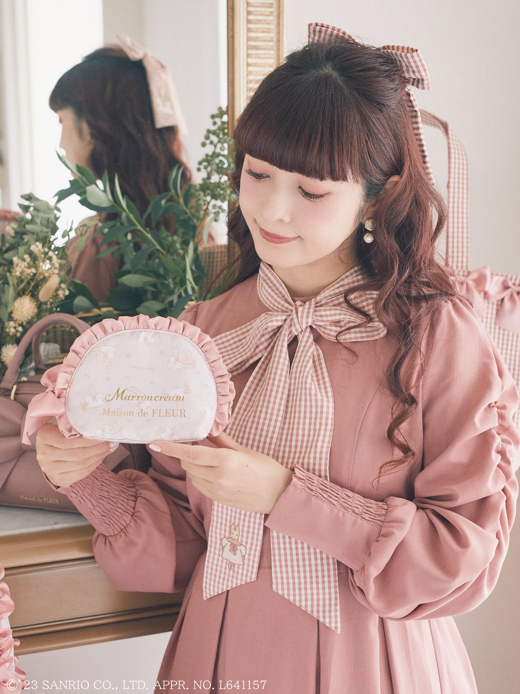 コラボアイテムはバッグやポーチ、ワンピースの全7型。ギンガムチェックをポイントにあしらったワンピースは、大人可愛いデザインに仕上げました。顏周りを華やかに演出してくれるボウタイリボンには、マロンクリームの刺繍を施しました。リボンは取り外し可能で、気分にあわせて着用いただけます。ガーリーなピンクと、クラシカルなブラックの2色をご用意いたしました。