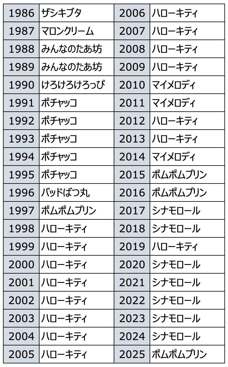 2位は昨年まで5連覇していた「シナモロール」(昨年1位)、3位は、1990年代に5連覇の記録を持ち、ここ数年でV字回復を遂げた「ポチャッコ」(昨年2位)。 4位は、20周年のアニバーサリーイヤーの「クロミ」(昨年3位)が、5位には昨年50周年を迎えた「ハローキティ」(昨年5位)が続いてランクイン。世界的に人気を集めるキャラクターたちの強さを感じさせる結果になりました。