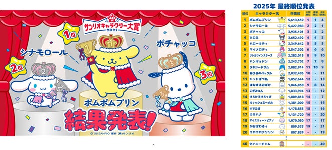 株式会社サンリオ(本社:東京都品川区、社長:辻󠄀 朋邦、以下サンリオ)は、今年で40周年を迎えたサンリオキャラクターの人気投票イベント「2025年サンリオキャラクター大賞」の最終結果を、6月29日(日)14時に発表いたします。総得票数は史上最多の6,316万696票(昨年比111%)となりました。第1位に輝いたのは「ポムポムプリン」(昨年4位)。ポムポムプリンは今年、国内だけでなく海外票も多く獲得し初回速報、中間発表ともに首位をキープ。最終順位で9年ぶり通算4度目となる1位に返り咲きました。
