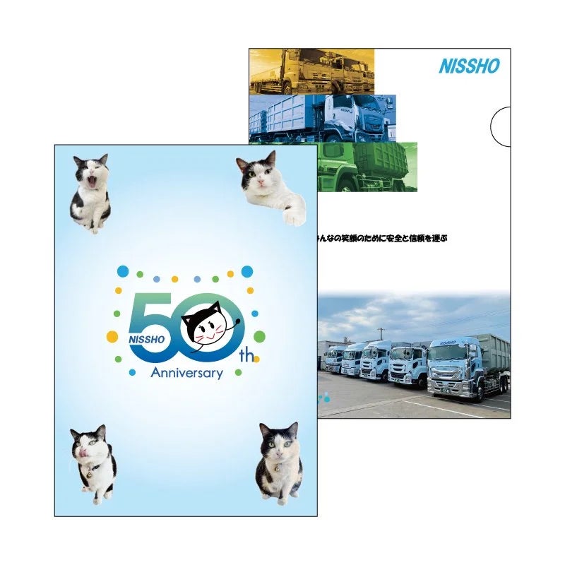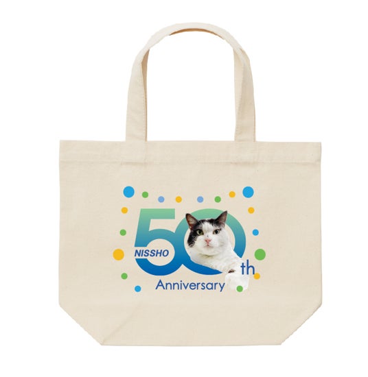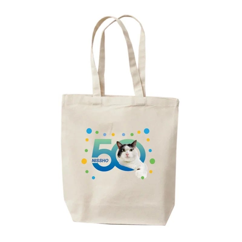 インスタグラムで大人気の会社ねこ「ふく」がデザインされた「株式会社日章」の50周年を記念したグッズが販売開始となりました。