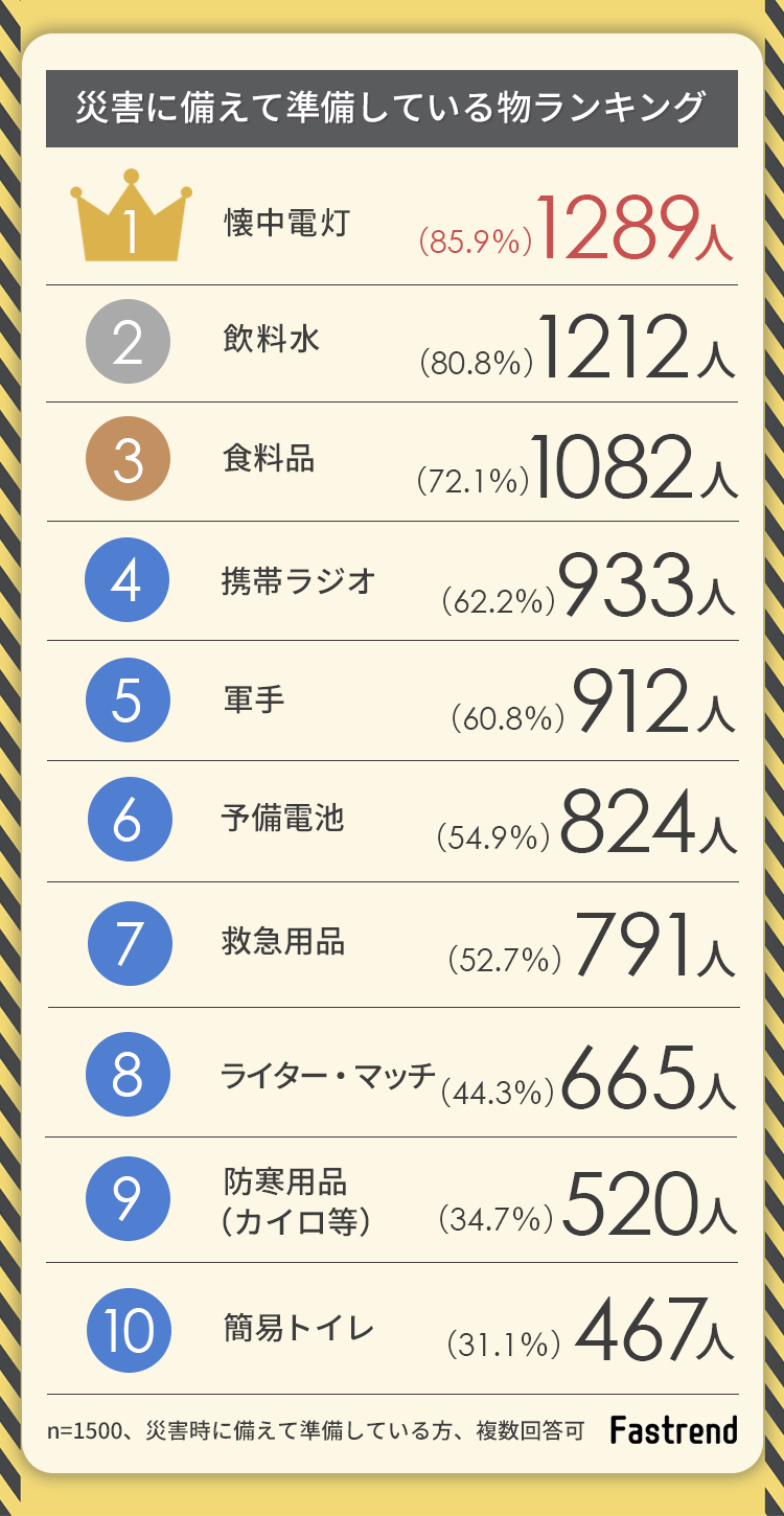 災害に備えて準備している方が多いものをランキング形式で紹介します!