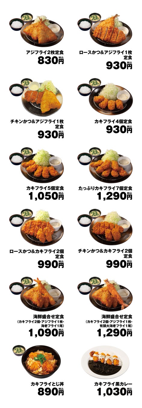 今回は、スパイシーで奥深く、食べ進めるごとにじわじわと辛さが押し寄せる「黒カレー」を使用した「カキフライ黒カレー」(※1)や、朝からアジフライをお得に頬張ることができる「得朝アジフライ定食」(※2)も店舗限定で販売。豊富なラインナップでお届けしますので、ぜひご賞味ください。