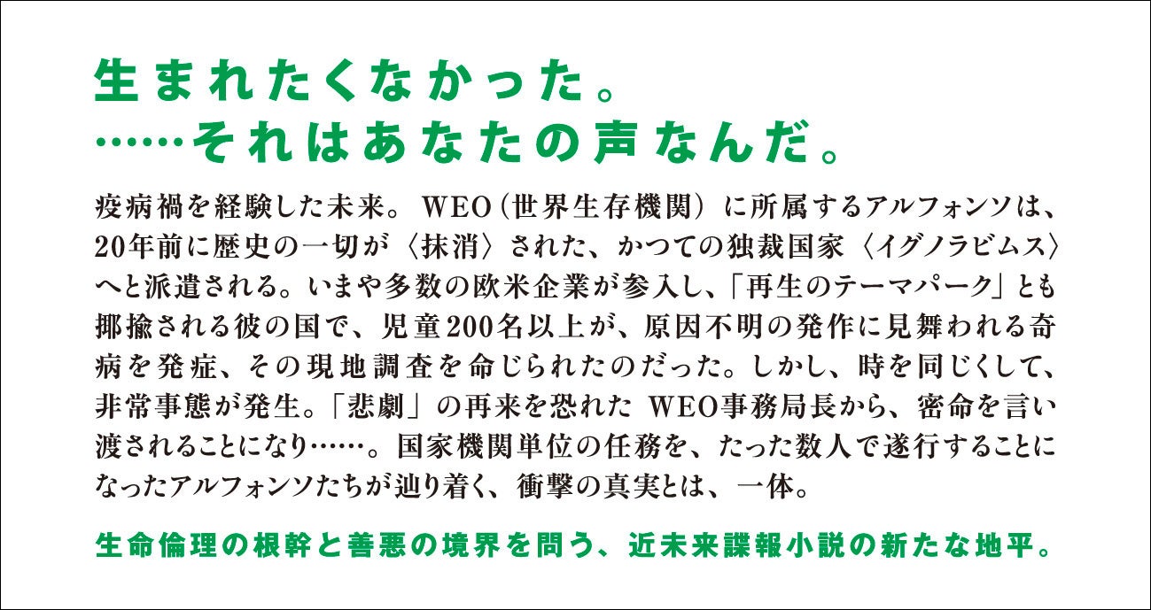 疫病禍を経験した未来。WEO(世界生存機関)に所属するアルフォンソは、20年前に歴史の一切が〈抹消〉された、かつての独裁国家〈イグノラビムス〉へと派遣される。