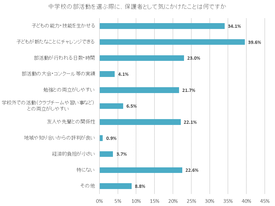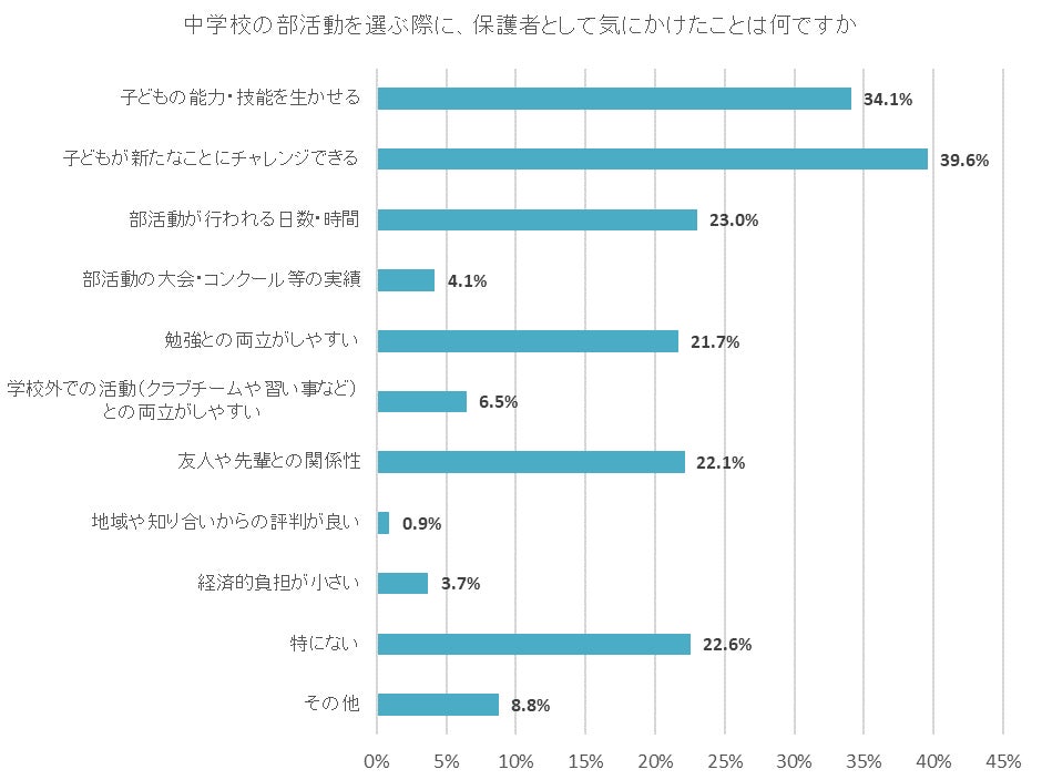 次に、子どもが中学校の部活動に所属している・所属していたと回答した保護者に、部活動を選ぶ際に保護者として気にかけたことを聞いた。最も割合が高かったのは「子どもが新たなことにチャレンジできる」で39.6%、次いで「子どもの能力・技能を生かせる」が34.1%、「部活動が行われる日数・時間」23.0%と続いた。