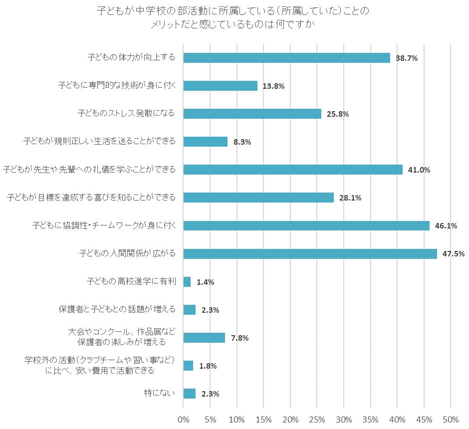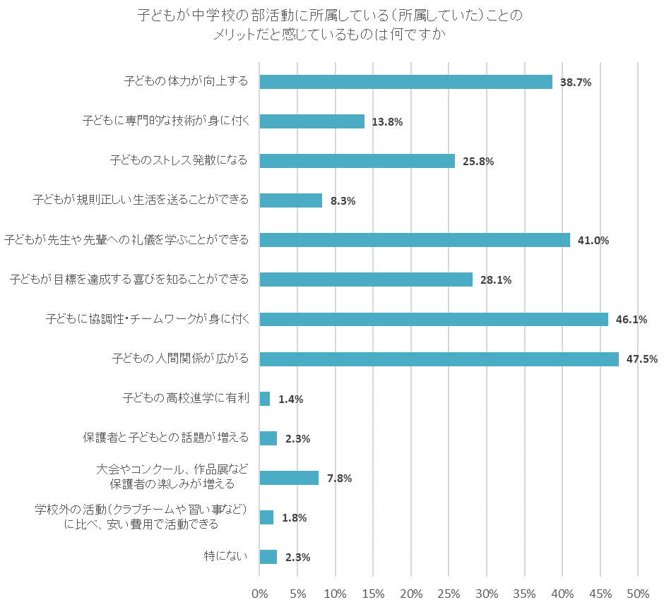 「子どもの人間関係が広がる」が47.5%と最も多く、次いで「子どもに協調性・チームワークが身に付く」が46.1%、「子どもが先生や先輩への礼儀を学ぶことができる」が41.0%だった。