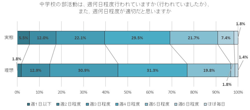 2019年に行った調査では、部活動の活動日数は「週5回程度」が29.3%と最も多かったが、今回の調査では「週4回程度」が最も多い結果となった。また、中学生の保護者のみの回答と、高校生の保護者のみの回答を比較すると、中学生の保護者は「週4回程度」が最も多い一方、高校生の保護者が回答した、子どもが中学生の頃の活動日数は「週4回程度」と「週5回程度」が同割合だった。