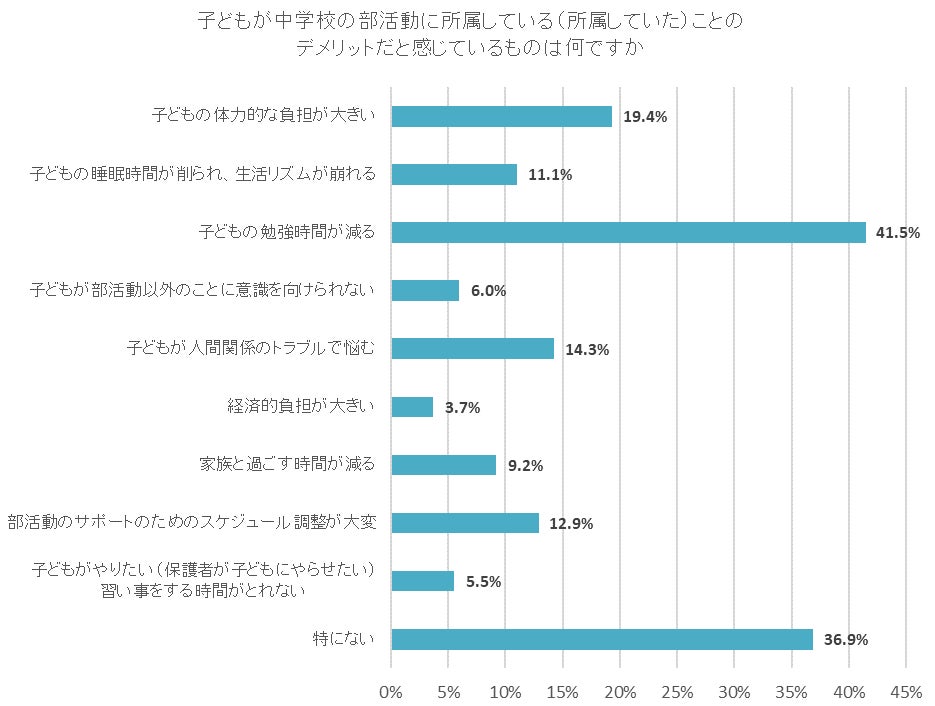「子どもの勉強時間が減る」と回答した保護者が41.5%と最も多かったものの、「特にない」と回答した保護者が次いで多く、36.9%だった。