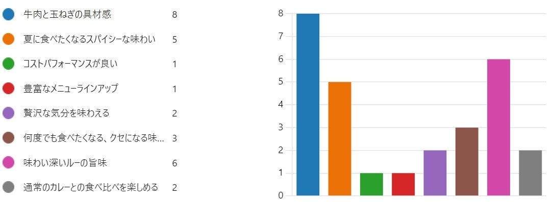 最も多くの票を集めたのは『牛肉と玉ねぎの具材感』というポイントでした。以下2位は『味わい深いルーの旨味』、『夏に食べたくなるスパイシーな味わい』でした。
