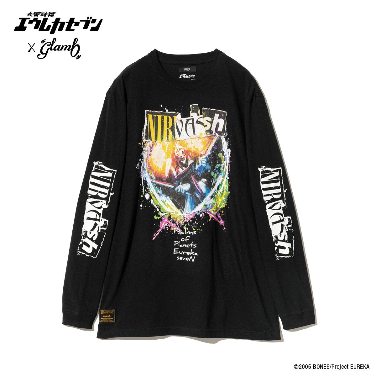 作品を代表する機体、ニルヴァーシュのスペックアップバージョンをロングスリーブTシャツに落とし込んだNIRVASH type ZERO spec 2 Cutsew。フロントに迫りくるのは敵機に立ち向かうニルヴァーシュ。バンド名をコラージュしたロゴ使いや構図にロックのエッセンスを散りばめながら、アニメーションにおけるエフェクトも表現することで戦闘シーンの躍動感も加えています。