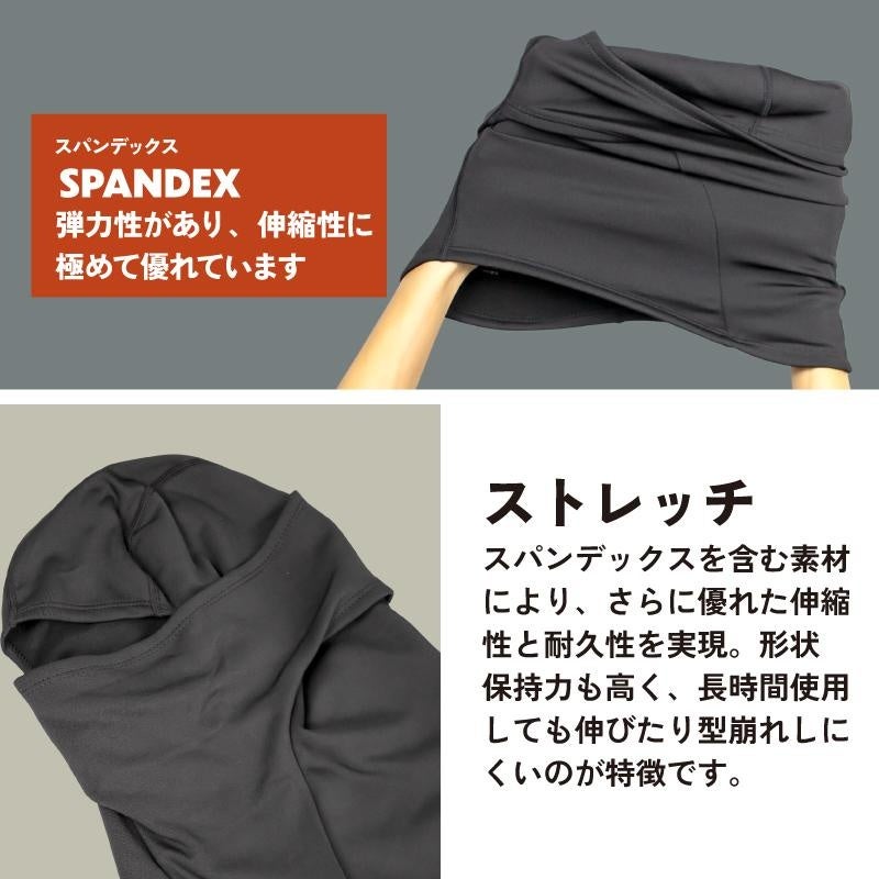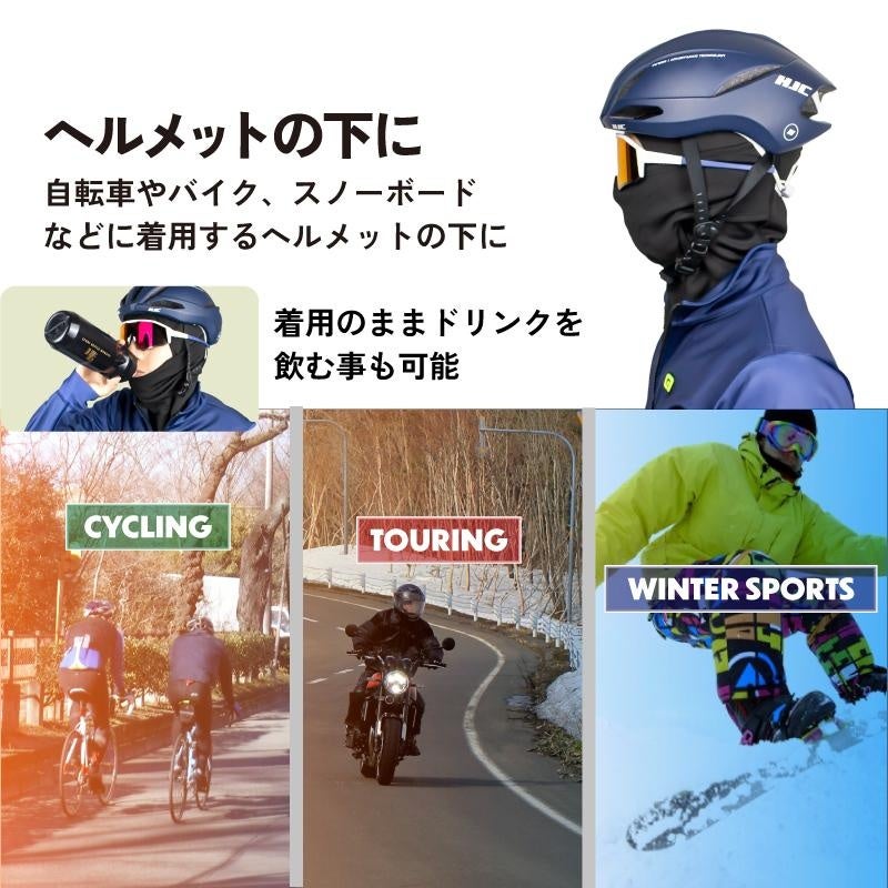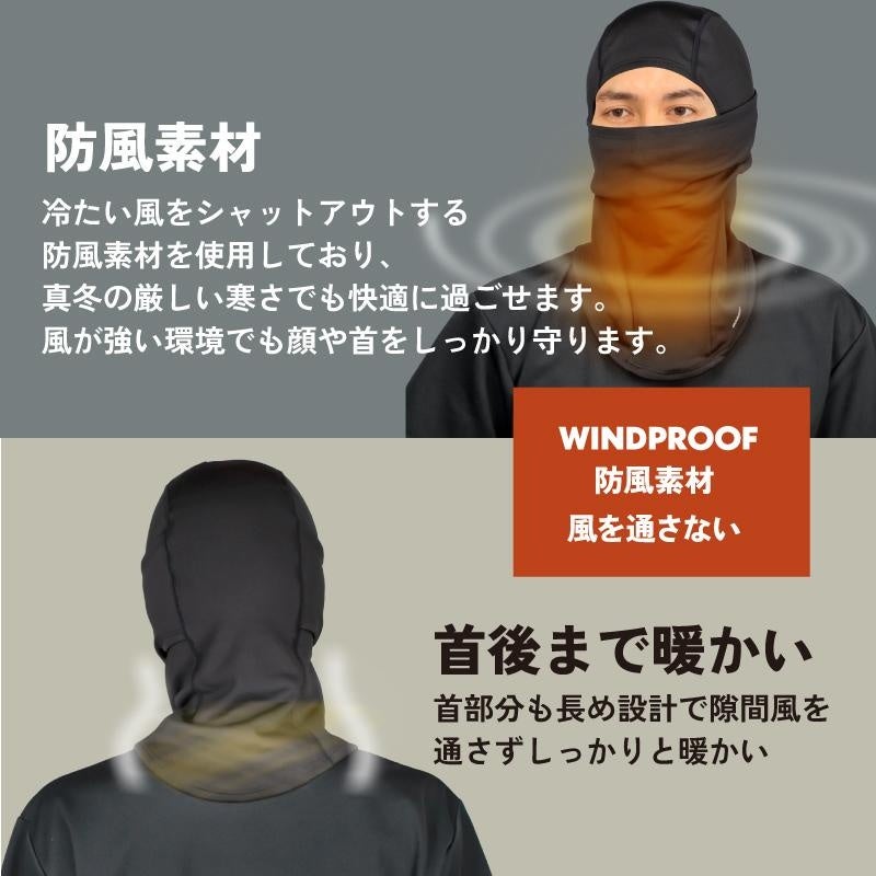 しっかりと保温し、防風素材で冷たい風を完全にシャットアウトします。目元以外を全てカバーし、耳や首までしっかりガードし保温します。厚すぎずごわつかない生地で、ヘルメットの下にも快適に着用可能です。