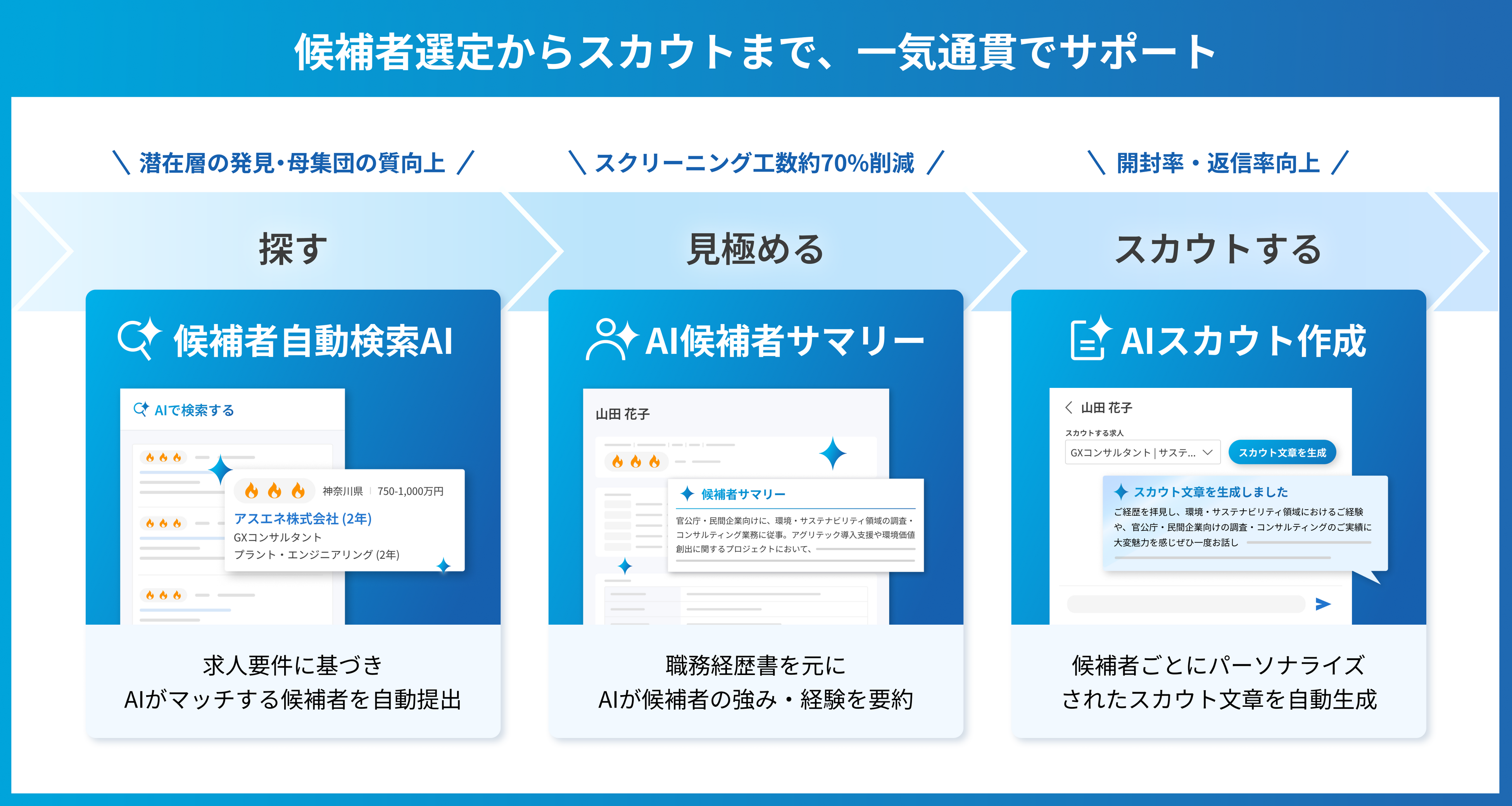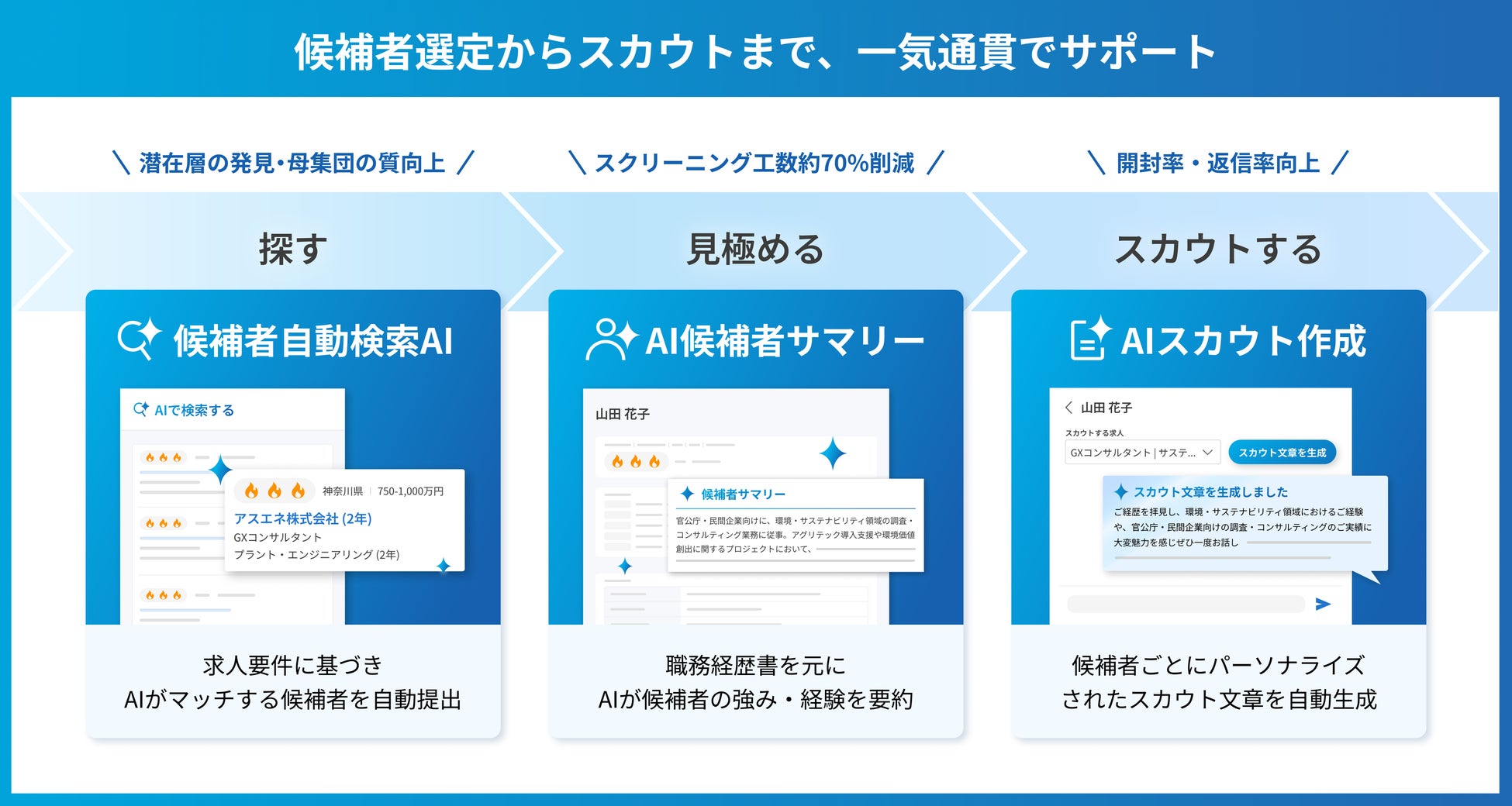 こうした現状が、適合する人材の特定を難しくし、選考プロセスの長期化を招く要因となっています。具体的には、蓄電池と太陽光パネルなど関連性の高いGX用語の文脈を一致させて理解できず、従来のキーワード検索では優秀な層を取りこぼす要因となっていました。また、候補者の膨大なレジュメの情報を読み込み、自社の募集要項との適合性を見極める作業には多大な時間を要しています。さらに、返信率の向上に欠かせない、候補者の経歴に合わせたスカウト文面の作成も、採用担当者の大きな実務負担となっていました。こうした実務上の障壁を解消するため、「ASUENE CAREER」はAI技術を活用し、候補者の選定からアプローチまでの各工程を効率化する「候補者検索AI」「AI候補者サマリー」「AIスカウト作成」の3つの機能を追加しました。