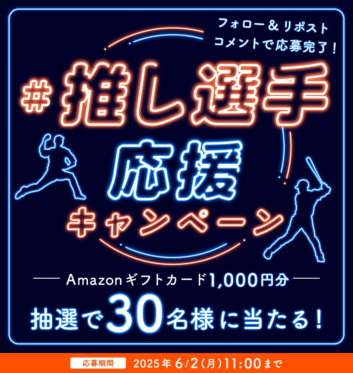 報知新聞社が運営するウェブサイト「EntaPark(エンタパーク)」と「Baseball Post(ベースボールポスト)」は、推し活に励むみなさんを応援する“推し事”キャンペーンを公式Xアカウントで実施いたします。今回のキャンペーンでは、抽選でAmazonギフトカード1,000円分をそれぞれ30名様にプレゼントします。この機会に、あなたの推しへの熱い思いやメッセージを聞かせてください!