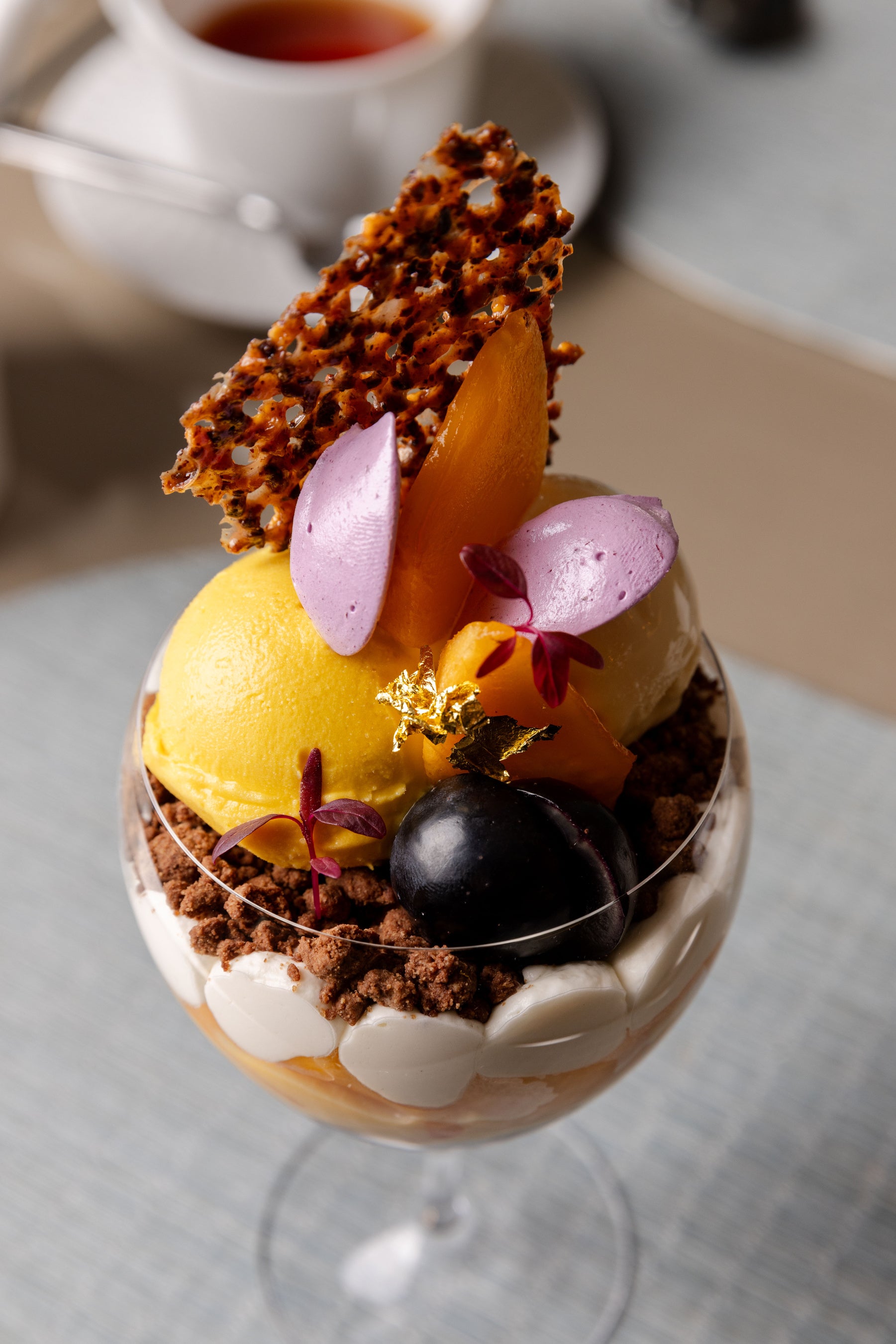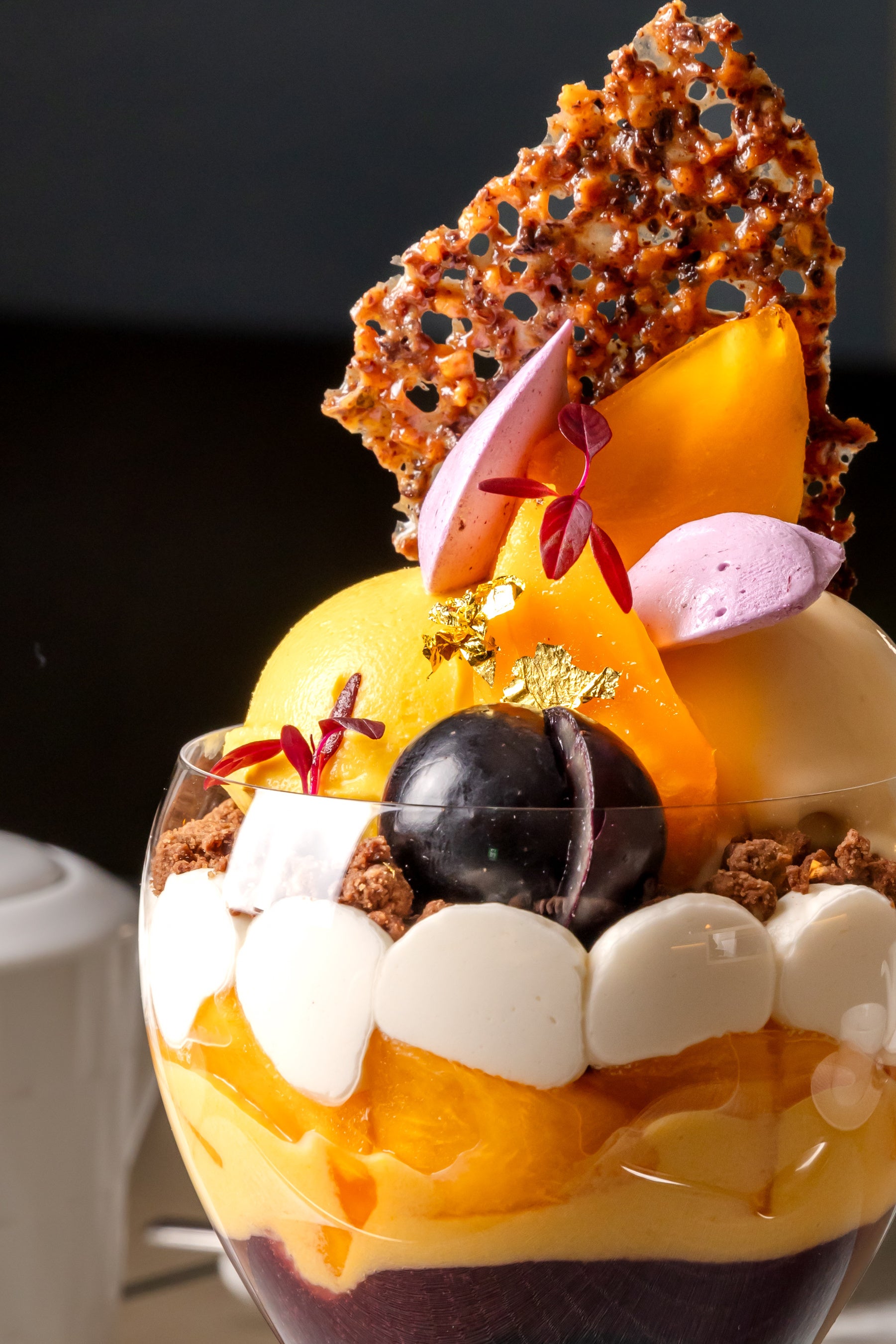 アルマーニ / カフェ 表参道の人気メニュー、月替わりのパフェ。10月は、旬の長野パープルと柿を主役に、カボチャやラムの香りを重ねた、秋の味わいが広がるパフェが登場します。