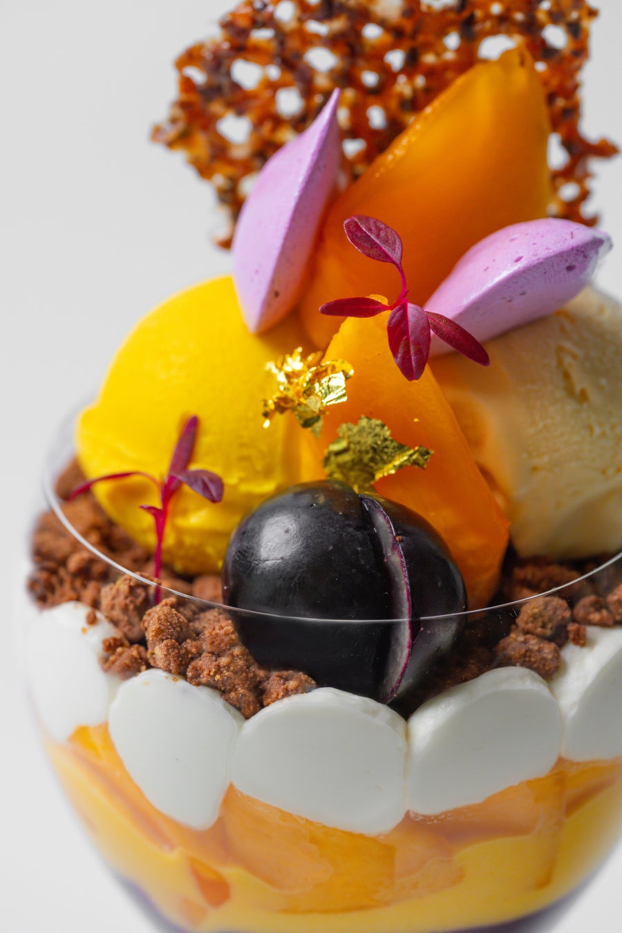 トップを飾るのは、カカオのほろ苦さをまとったチュイールと、サクサクと軽やかなカシスメレンゲ。フレッシュな長野パープルとみずみずしい柿に、カボチャのジェラートとラム香るジェラートを合わせ、豊かな果実感と奥行きのある味わいを楽しめます。