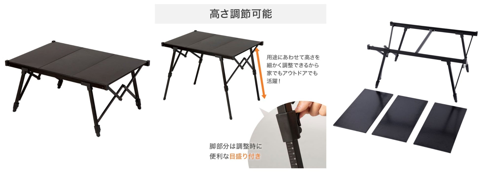 ■無段階調整が可能、耐熱・キズに強いアウトドアテーブル